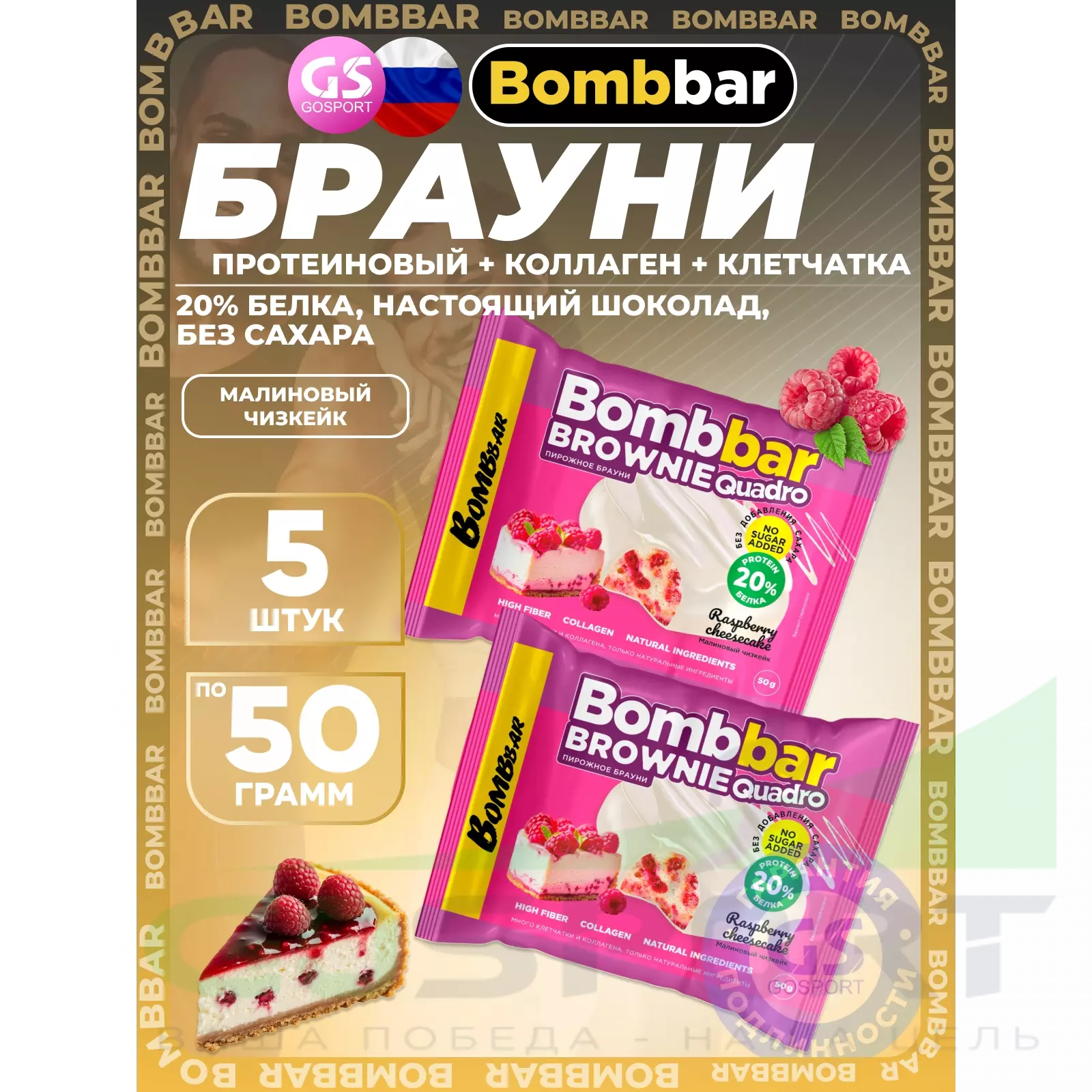 BombBar Печенье глазированное Brownie Quadro 5 x 50 г, Малиновый чизкейк — Полезный перекус и поддержка мышц
