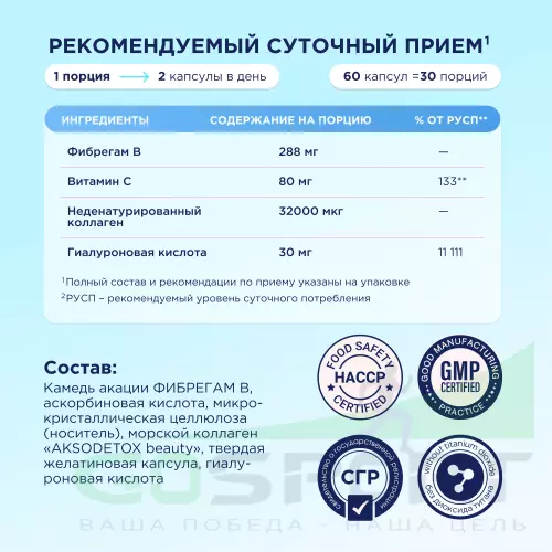 В состав Chikalab Marine collagen входит также гиалуроновая кислота, витамин С и Фибрегам.