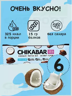 -10% 805 q 894 q 894 q 000 Протеиновый батончик Chikabar 6 батончика x 60 г, Кокос Chikalab В корзину Артикул 51011