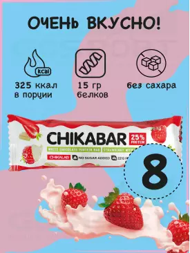 -22% 874 q 1 120 q 1 120 q 000 Протеиновый батончик Chikabar 8 x 60 г, Клубника со сливками Chikalab В корзину Артикул 51018