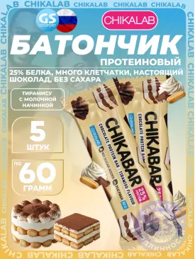 -22% 581 q 745 q 745 q 000 Протеиновый батончик Chikabar 5 x 60 г, Тирамису с молочной начинкой Chikalab В корзину Артикул 51003