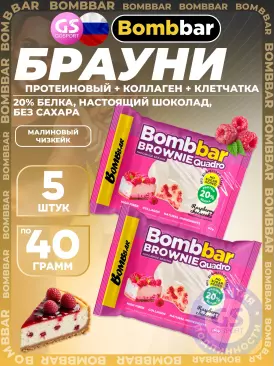 -25% 609 q 812 q 812 q 000 Протеиновый батончик Печенье глазированное Brownie Quadro 5 x 40 г, Малиновый чизкейк BombBar В корзину Артикул 57655