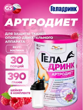 -20% 3 643 q 4 554 q 4 554 q 000 Комплекс хондропротекторов Артродиет (Geladrink Artrodiet) 390 г, Малина ГЕЛАДРИНК В корзину Артикул 2950