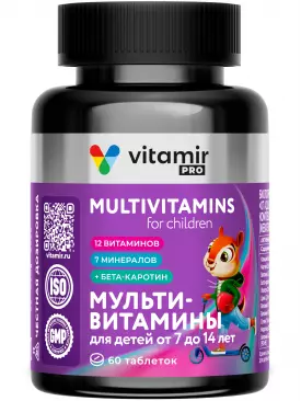-22% 579 q 742 q 742 q 000 Витамины для детей Мультивитамины для детей от 7 до 14 лет 60 жевательных таблеток, Вишня VITAMIR PRO В корзину Артикул 57501