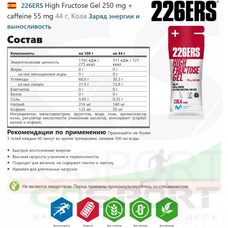 Состав 226ERS High Fructose Gel 250 mg + caffeine 55 mg