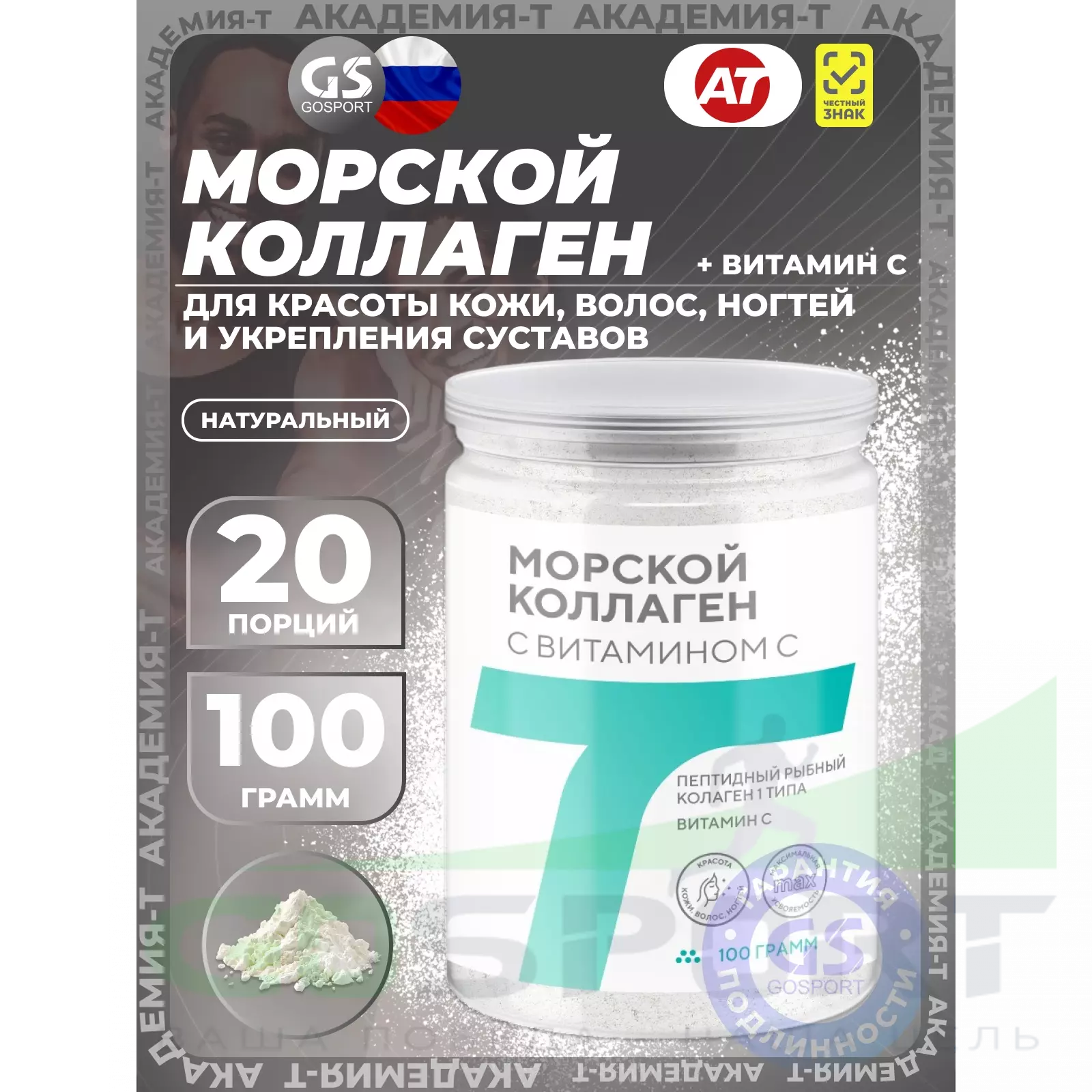 Академия-Т Морской коллаген с витамином C 100 г, Натуральный — Для красоты кожи, волос, ногтей и укрепления суставов