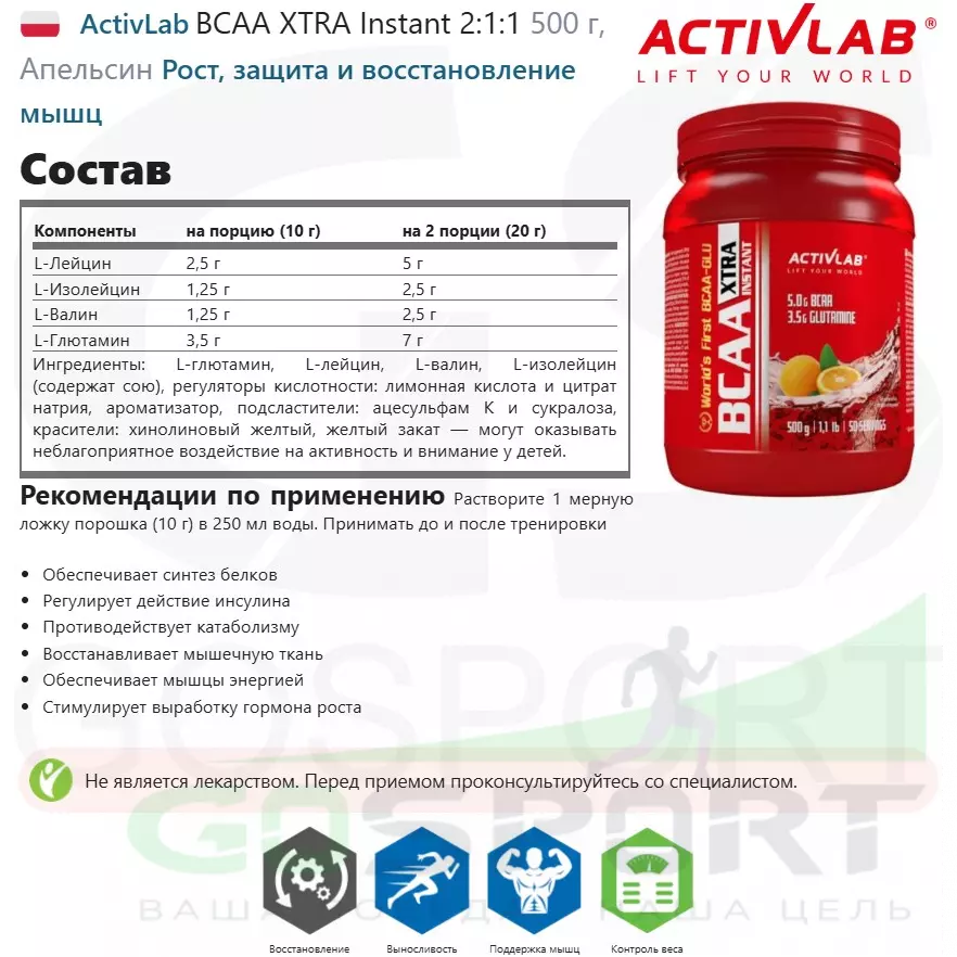 ActivLab BCAA XTRA Instant 2:1:1 500 г, Апельсин — Рост, защита и восстановление мышц