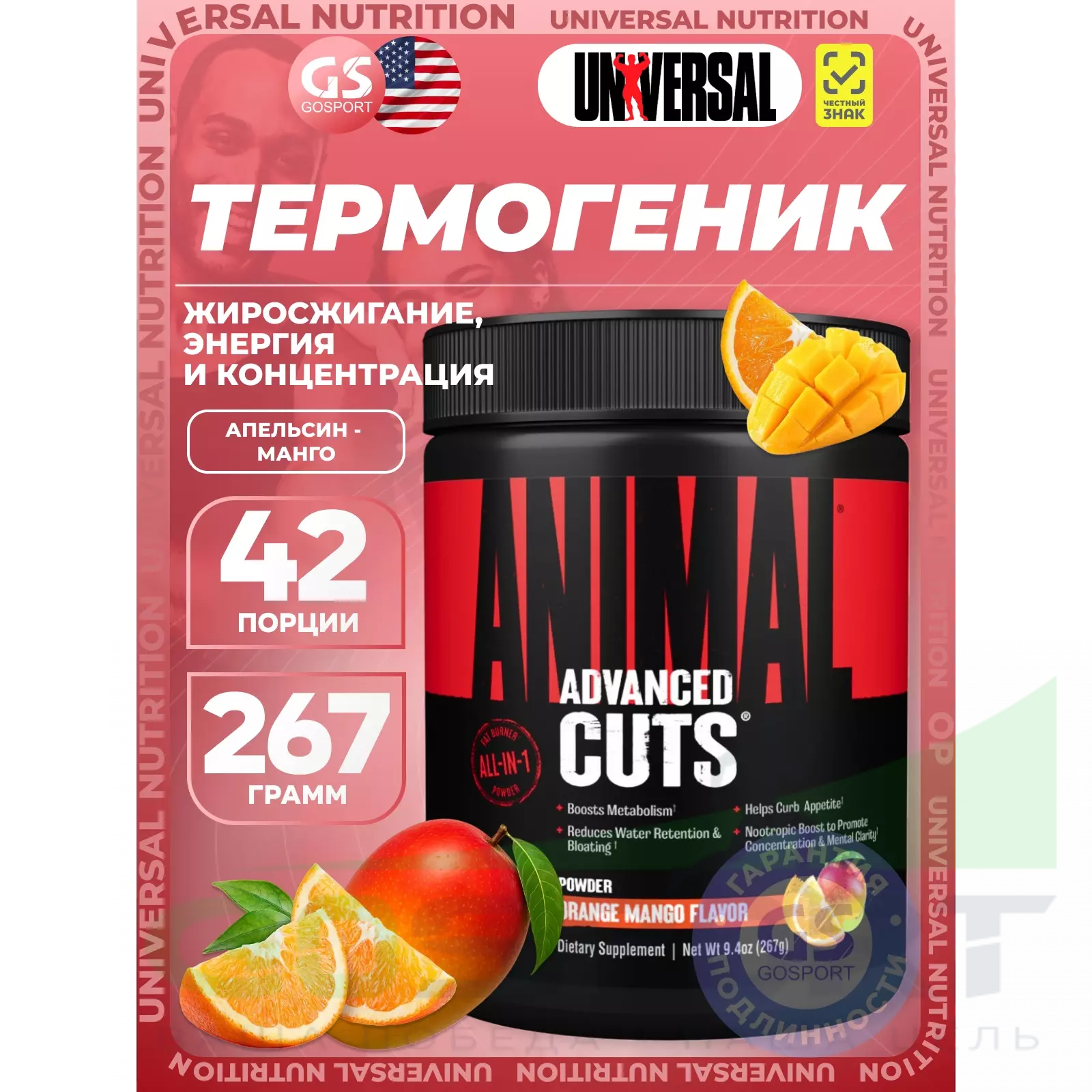 Animal Cuts — это не просто сжигатель жира, липолитик, диуретик или метаболик; все четыре в восхитительном на вкус порошке, содержащем ингредиенты, подтвержденные исследованиями, которые помогают сжигать жир как мужчинам, так и женщинам. Отмеченная наградами добавка, смешайте порошок Animal Cuts с любимым напитком для получения мощного термогенного сжигателя жира, который может помочь повысить естественную способность организма сжигать накопленный жир, одновременно способствуя набору сухой массы.