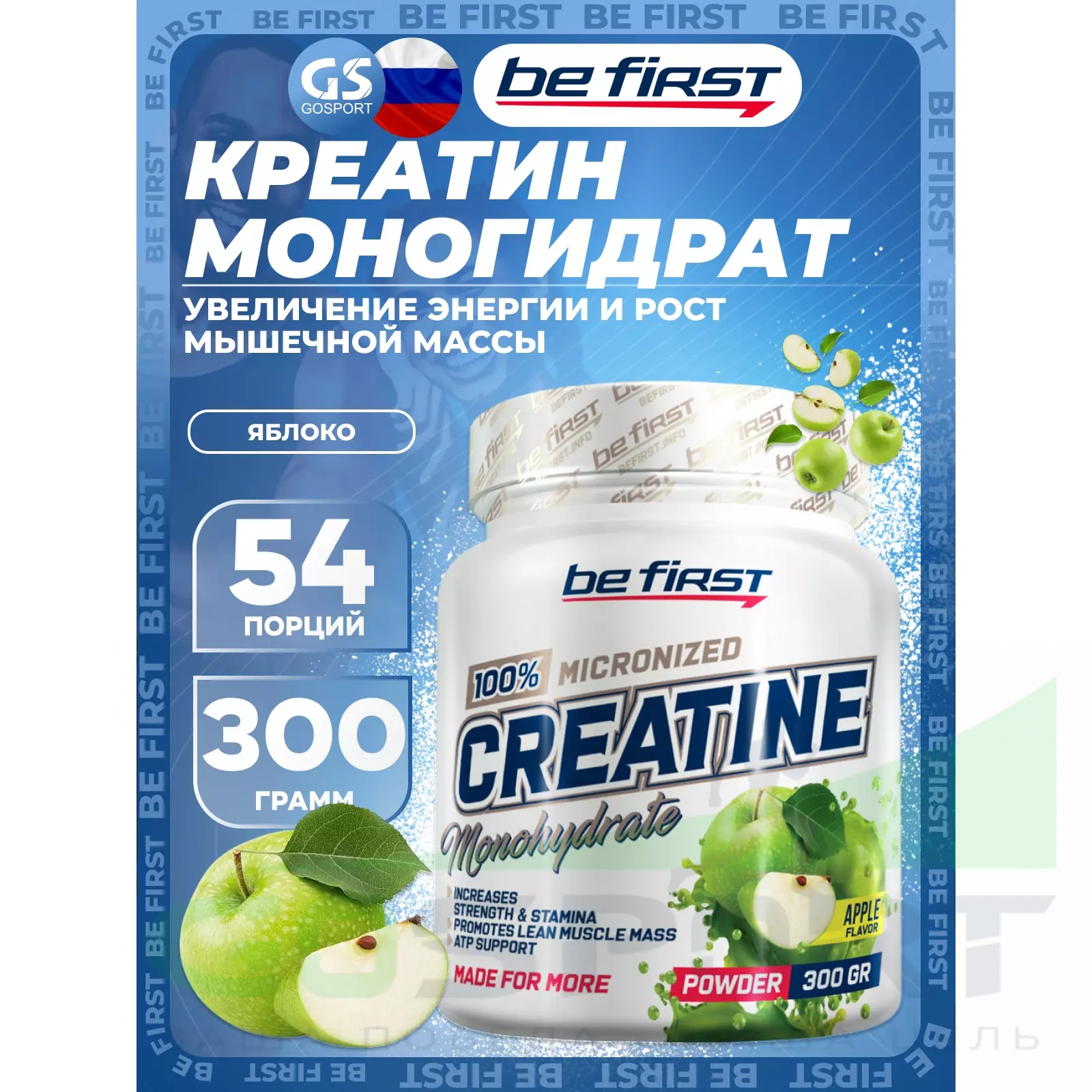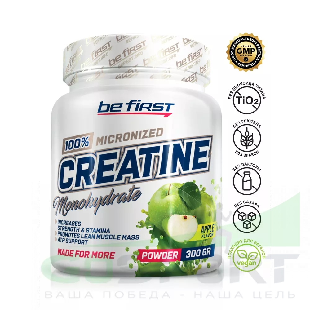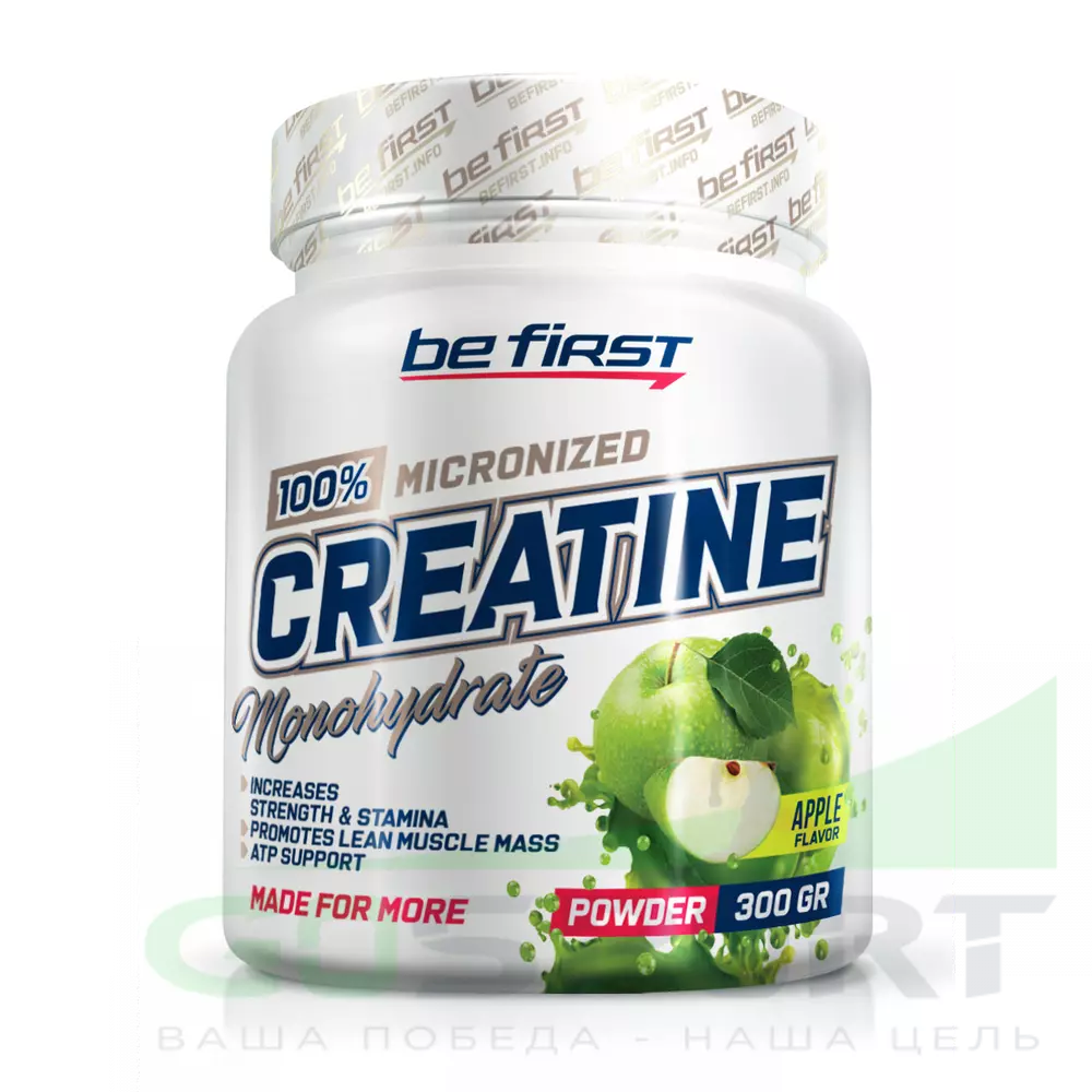 Be First Creatine Micronized Powder (креатин моногидрат) 300 г, Яблоко — Выносливость, сила и восстановление