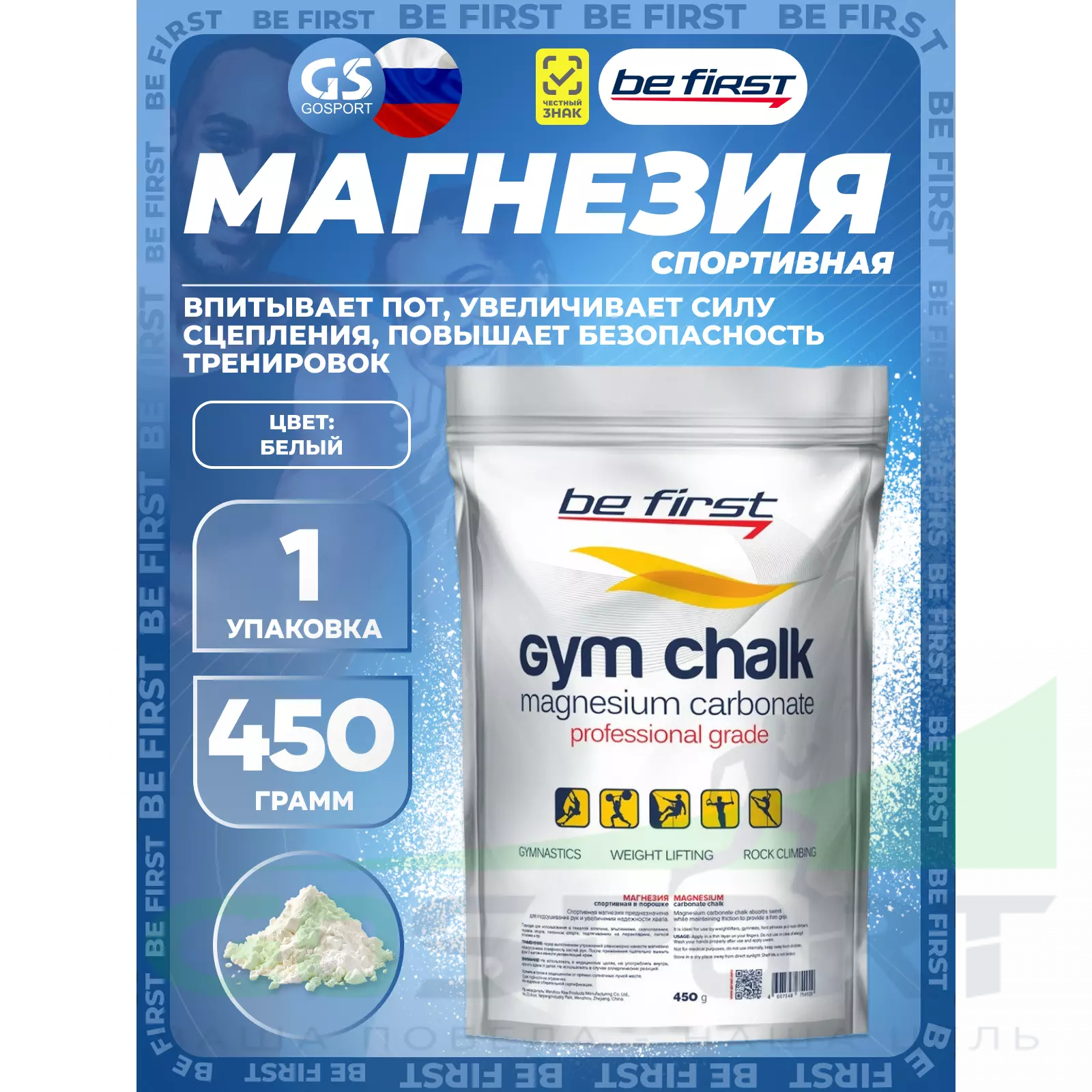 Магнезия Be First в новой упаковке позволяет расходовать это вещество более экономно, сберегая средства и реже заботиться о покупке новой порции. Также новая магнезия способствует сохранению чистоты в зале и бережет Вашу спортивную одежду и снаряжение от белых пятен. Новая упаковка значительно легче, чем банка или бутылка с жидкостью – ее можно положить в спортивную сумку и не беспокоиться о том, что она стала тяжелее. После вскрытия упаковки дойпак сохраняет герметичность, не позволяя магнезии рассыпаться и облегчая использование. Кроме того, всегда можно заказать пакет с необходимым для Вас количеством магнезии 100 г, 300 г или 450 г.
