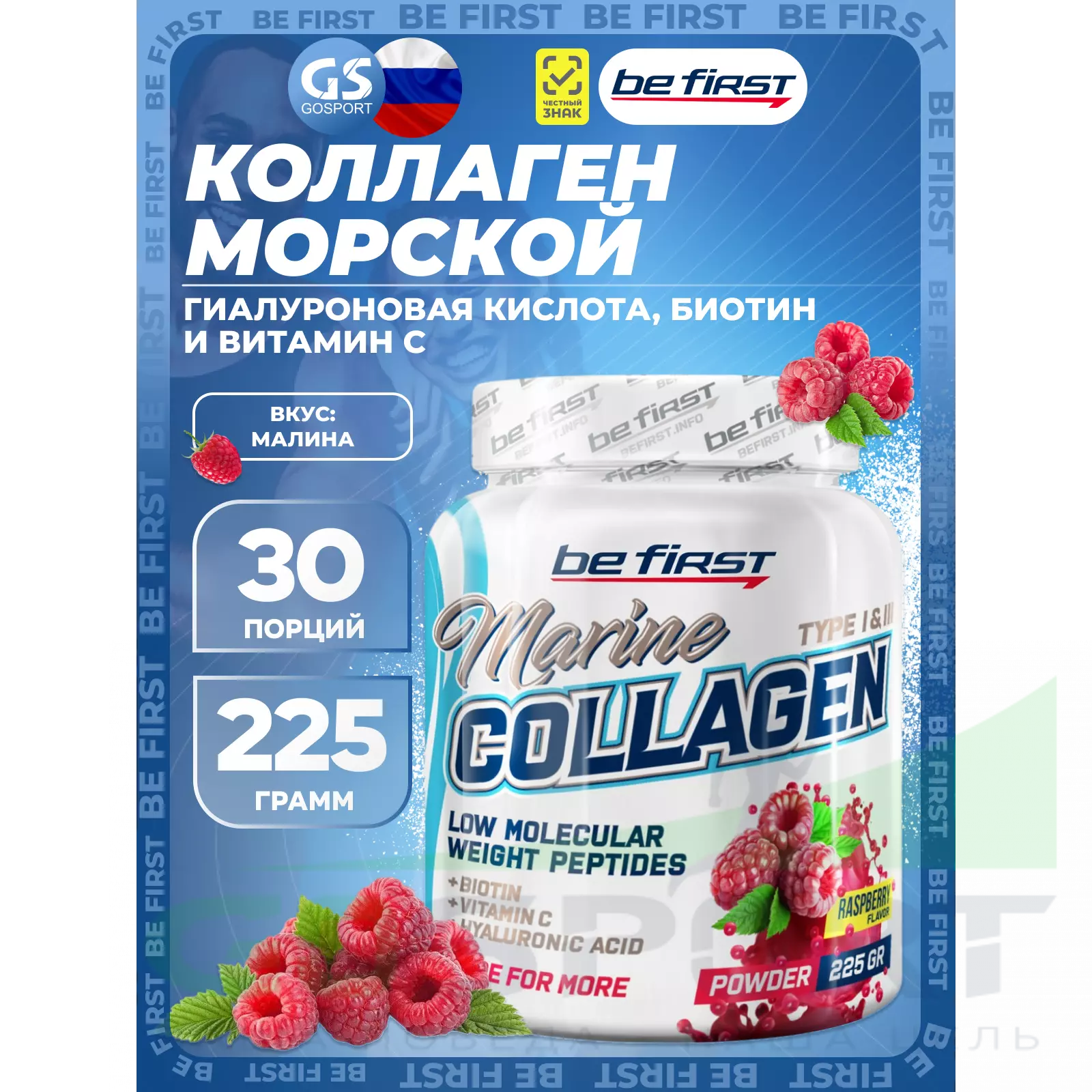 Be First Marine Collagen + Biotin + Hyaluronic acid + Vitamin C 225 г, Малина — Для поддержки и укрепления здоровья суставов, кожи и сухожилий