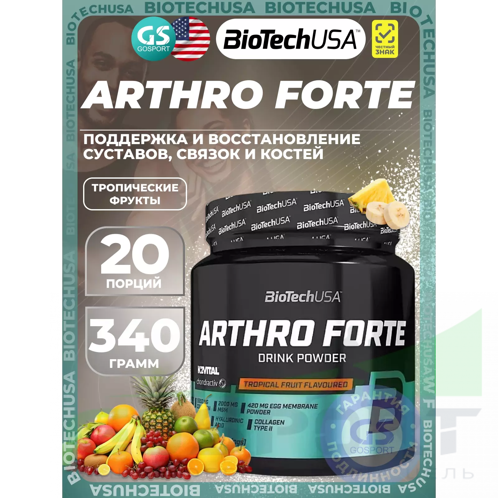 BioTechUSA Arthro Forte 340 г, Тропические фрукты — Поддержка и восстановление суставов, связок и костей