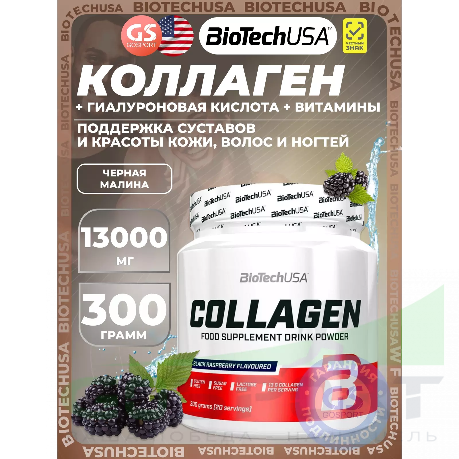 BioTechUSA Collagen 13000 mg 300 г, Черная малина — Поддержка суставов и красоты кожи, волос и ногтей