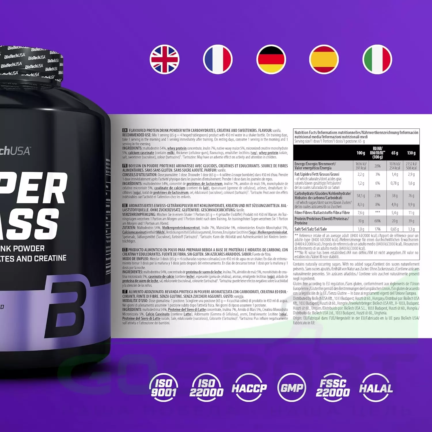 Высококалорийный гейнер Hyper Mass 5000 от BioTech USA восполнит потребности организма в белке, который способствует мышечному росту, а также обеспечит приток углеводов, поднимая уровень суточного потребления калорий. Разработан для тех, кому тяжело набирать массу. В каждой его порции также содержится 3250 мг креатина, который за счет воспроизводства АТФ увеличивает работоспособность организма.