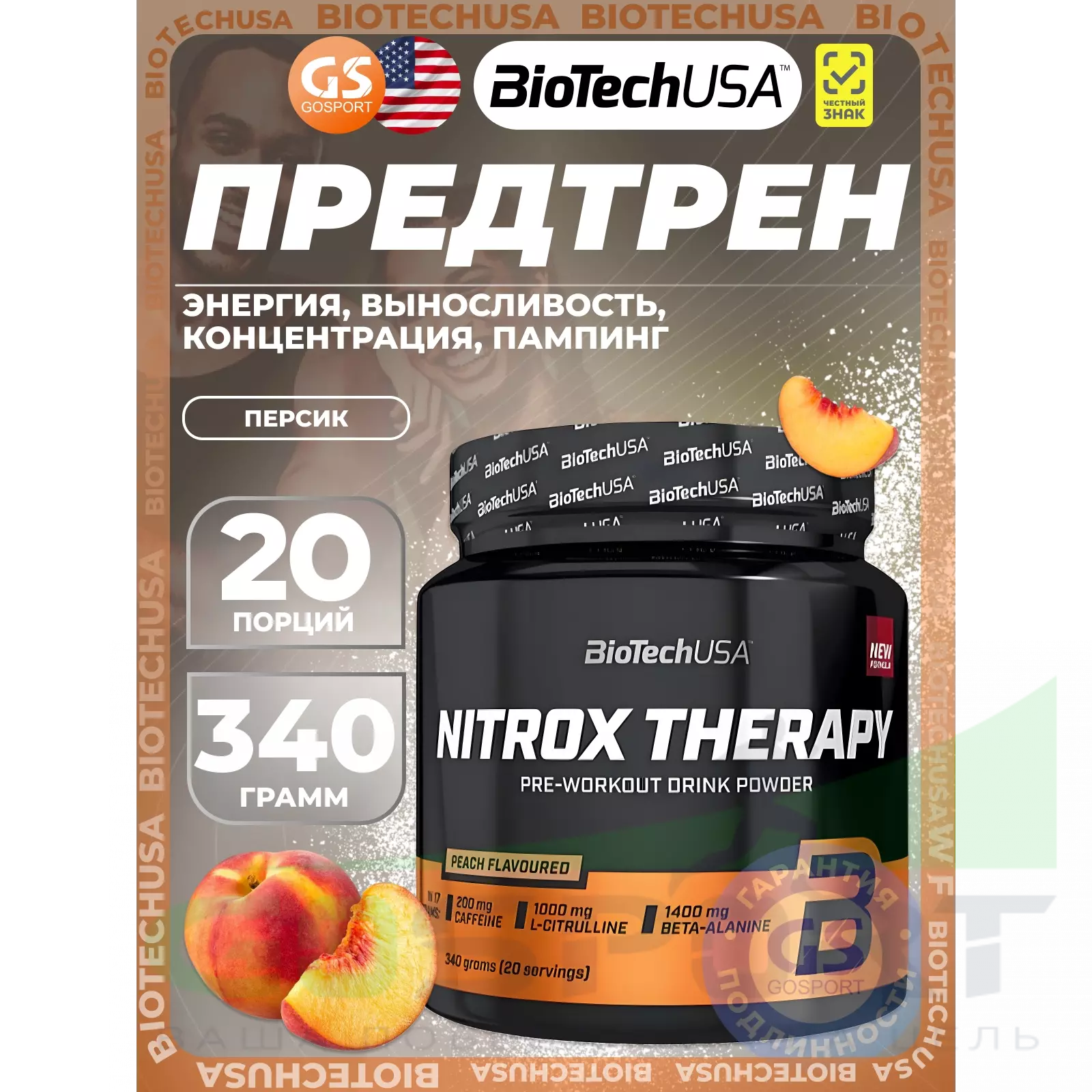 BioTechUSA Nitrox Therapy 340 г, Персик — Пампинг, энергия, концентрация, снижение усталости