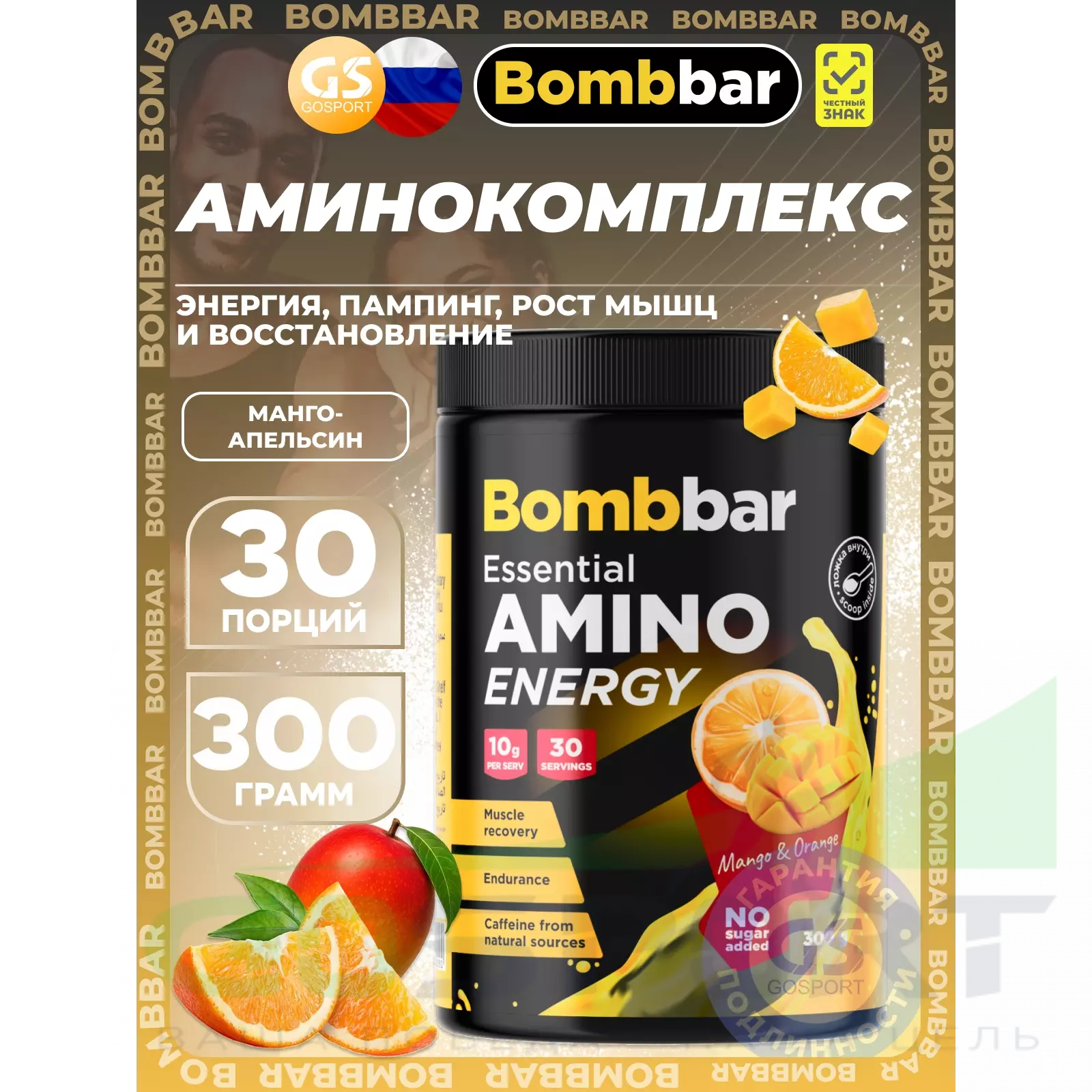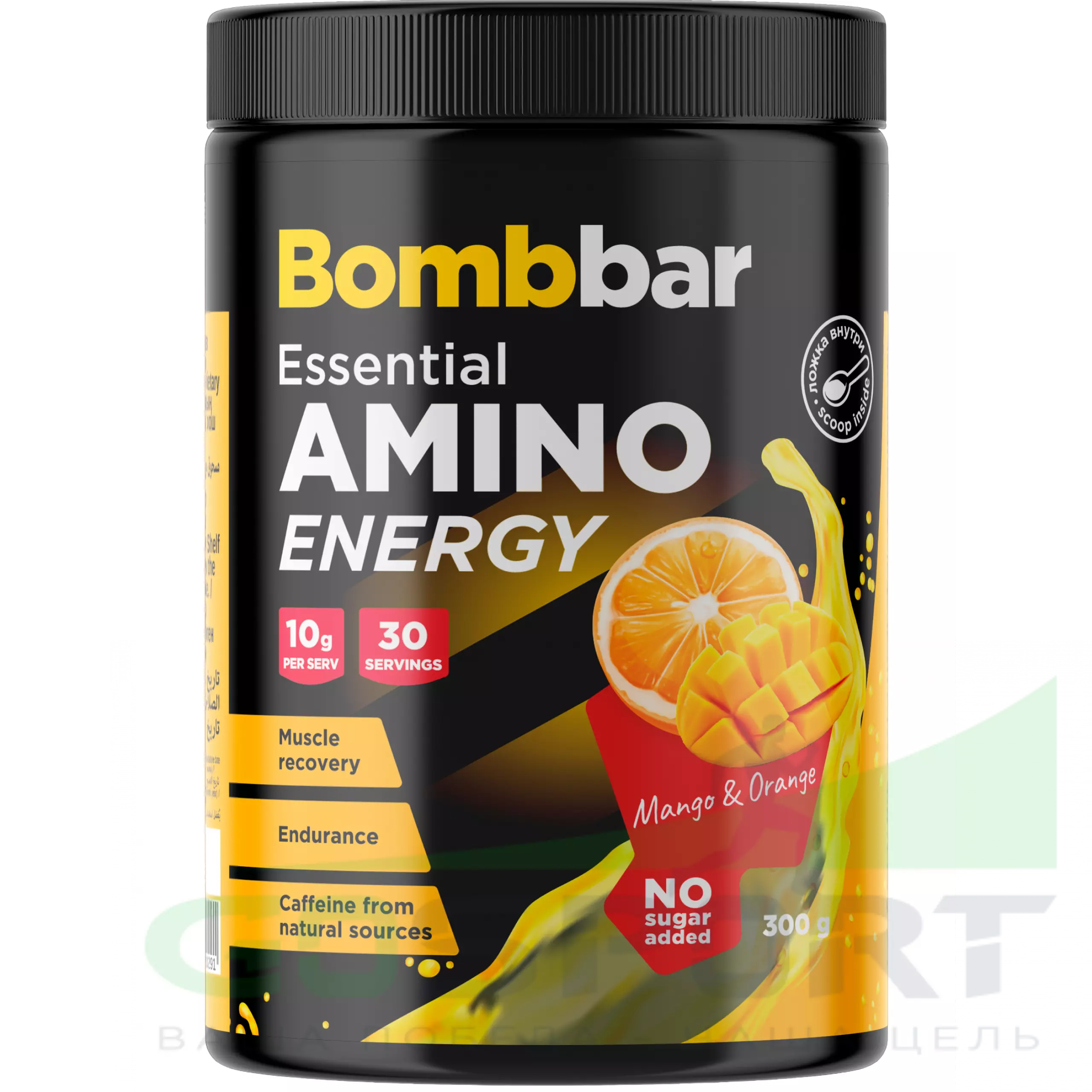BombBar Amino Energy 300 г, Манго-апельсин — Энергия, пампинг, рост мышц и восстановление