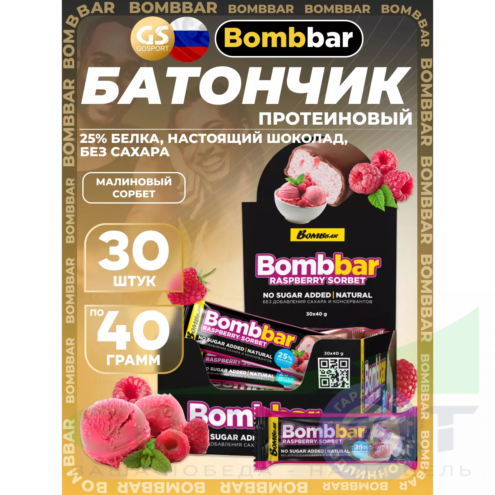 BombBar Батончики в шоколаде без сахара 30 x 40 г, Малиновый сорбет — Полезный и питательный перекус