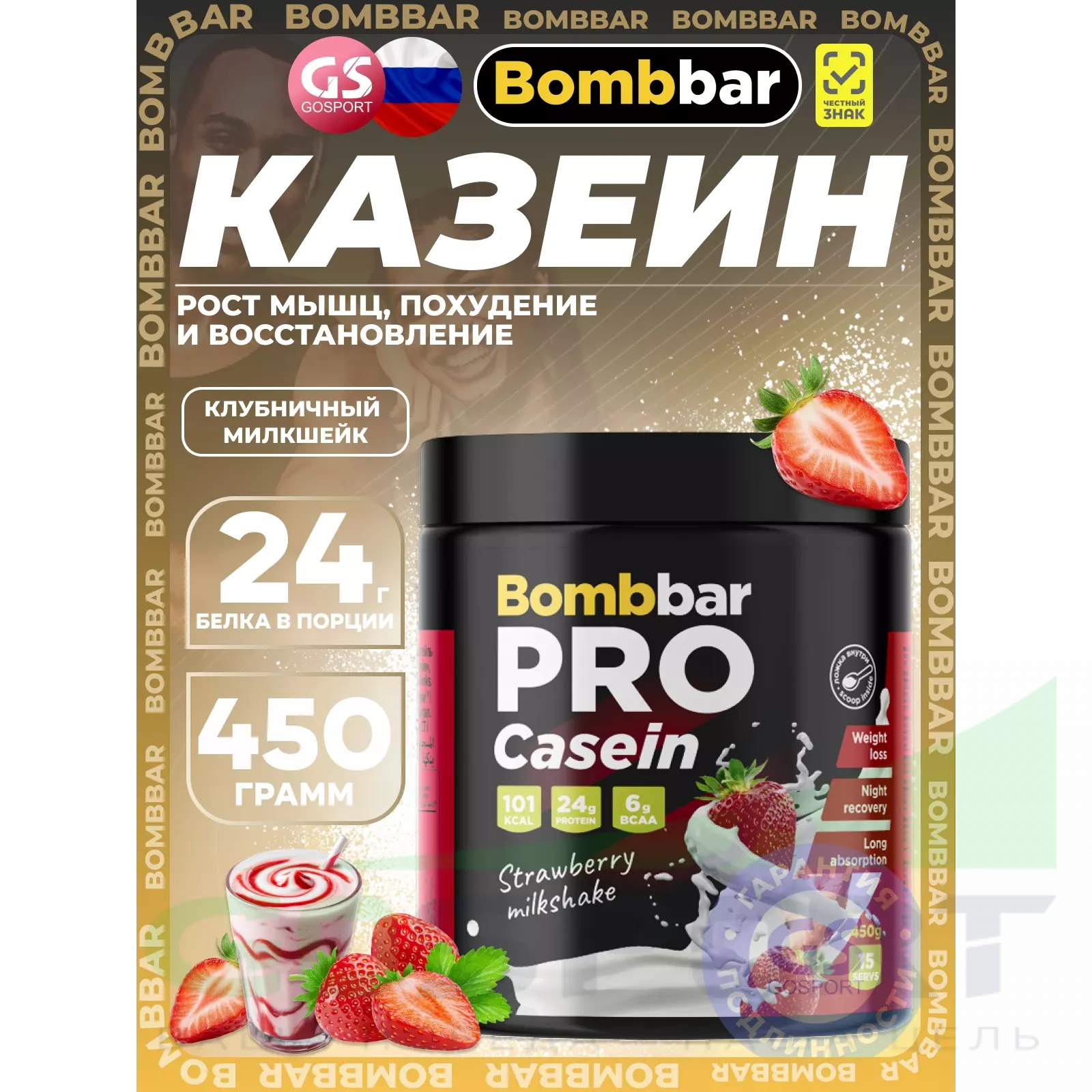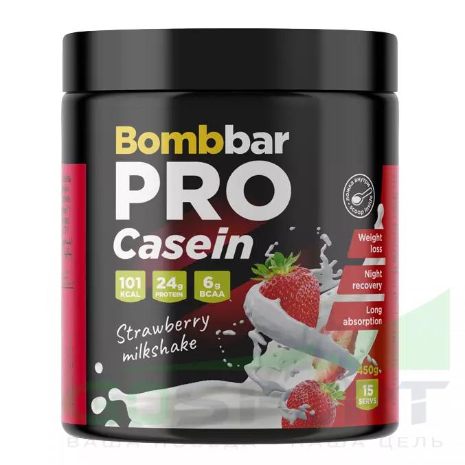 BombBar Pro Casein 450 г, Клубничный милкшейк — Рост мышц, похудение и восстановление
