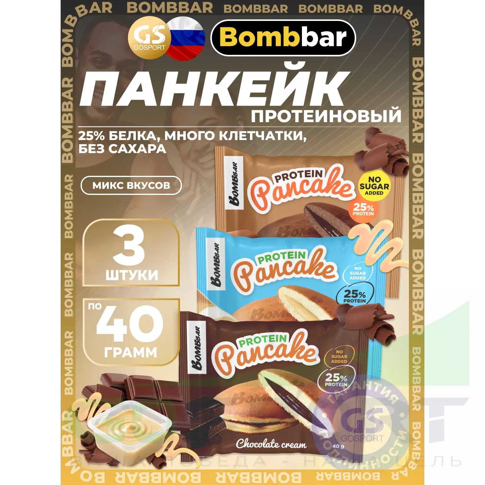 BombBar Панкейк протеиновый 3 х 40 г, Двойной шоколад, Шоколадный крем, Молочный крем — Полезный и питательный перекус