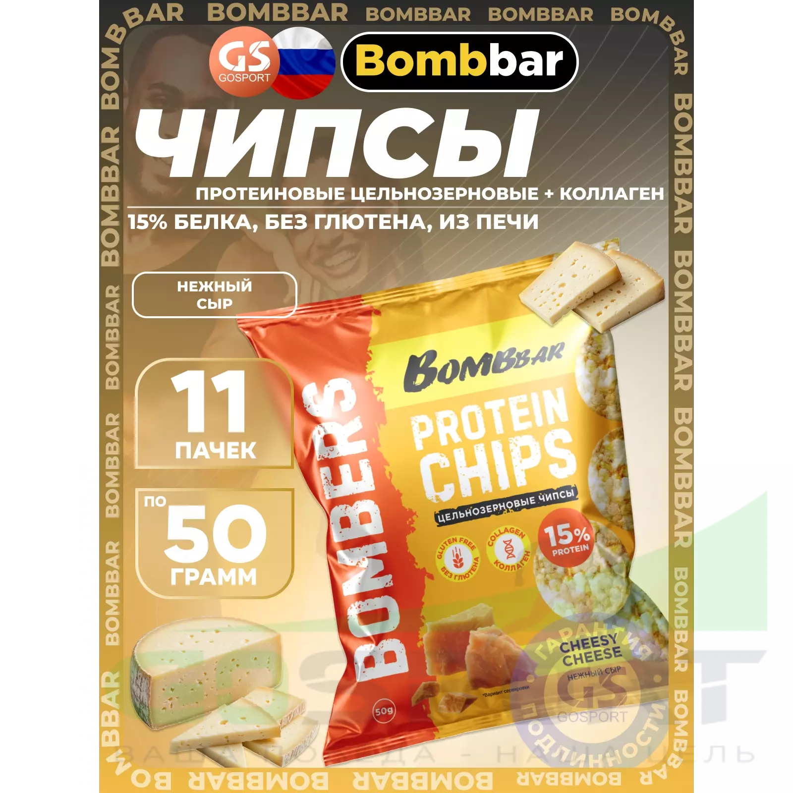 BombBar Protein Chips 11 x 50 г, Нежный сыр — Чипсы протеиновые цельнозерновые + коллаген