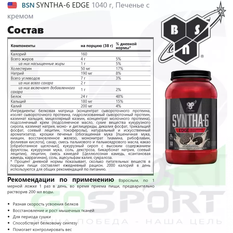 Syntha-6 EDGE от BSN – это протеин высокого качества для периода сушки. Он обладает превосходным вкусом. В его формуле присутствуют разные виды белков, которые налаживают подпитку мышц ценными нутриентами в течение долгого времени. Это все формы сывороточного белка, молочный концентрат, мицеллярный казеин, казеинат кальция, а также соевый белок. Каждый из названных протеинов по-своему полезен для организма, и не только за счет высокого уровня аминокислот. Их ценность состоит в том, что усваиваются они с разной скоростью.