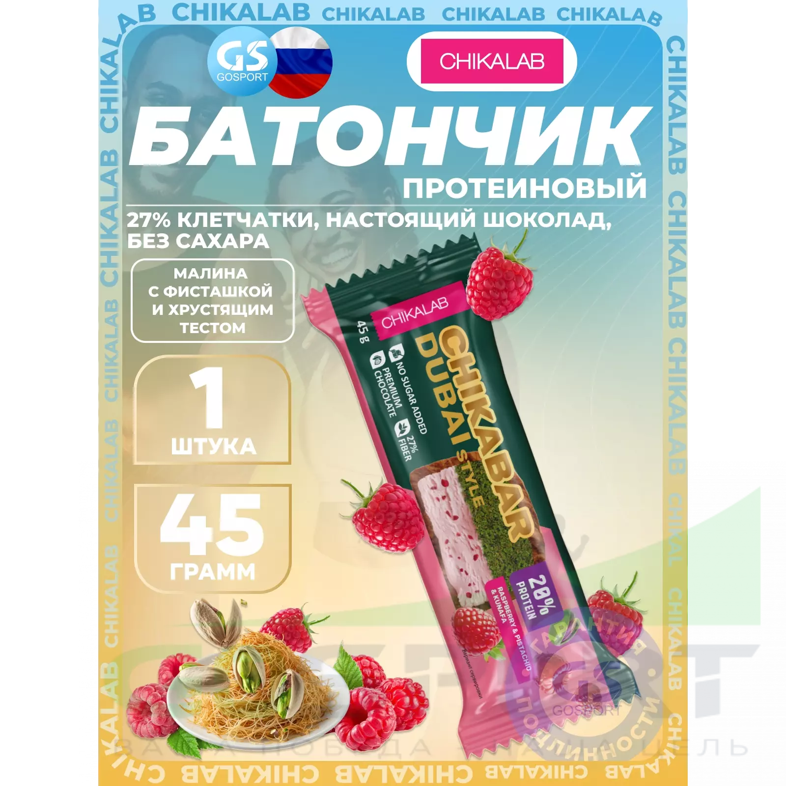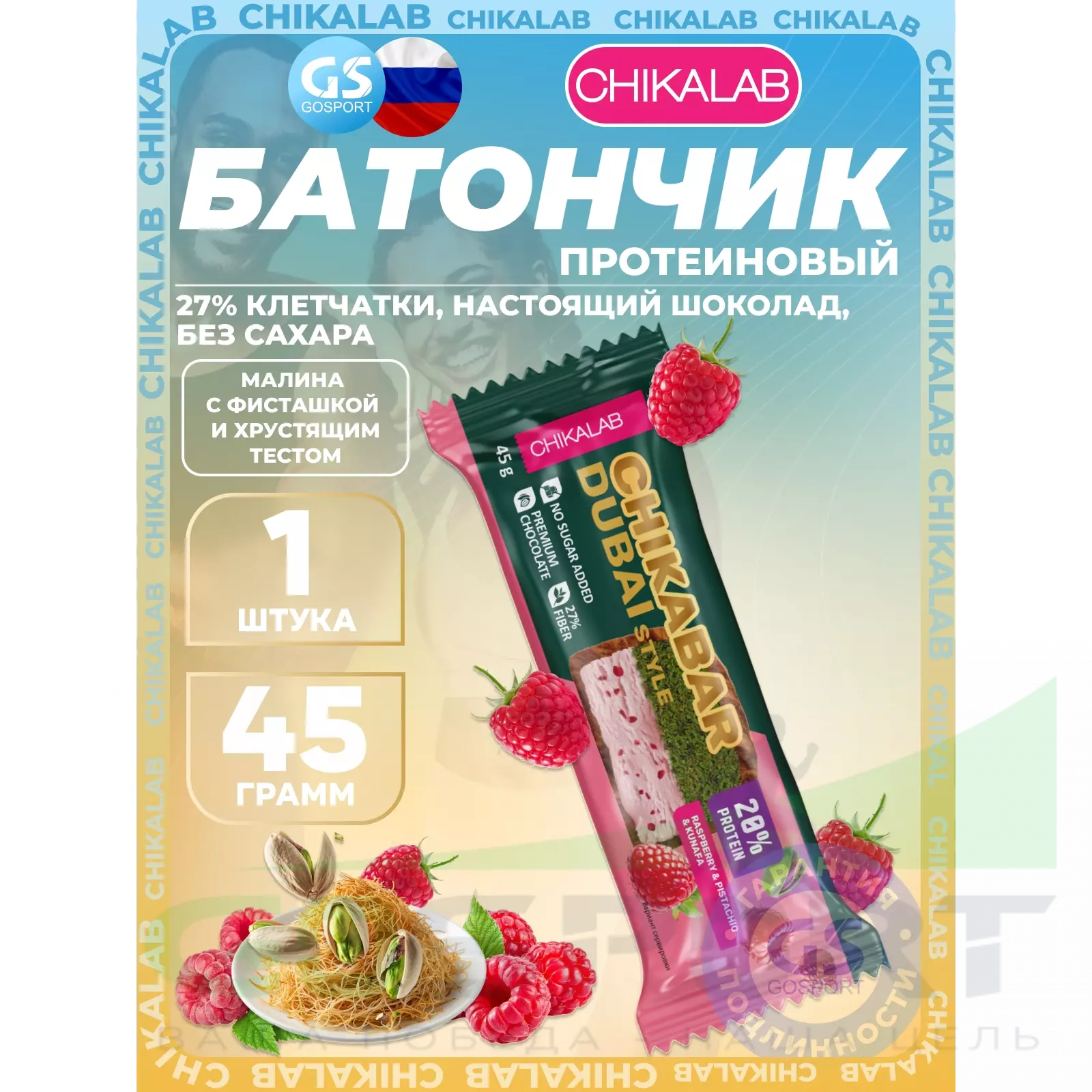 Chikalab Батончик глазированный Chikabar Dubai 45 г, Малина с фисташкой и хрустящим тестом — Полезный и питательный перекус