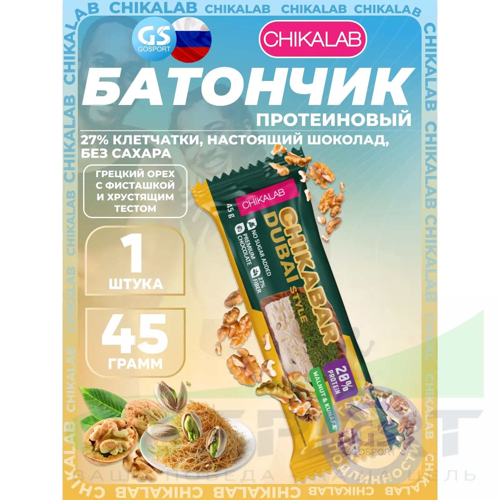 Chikalab Батончик глазированный Chikabar Dubai 45 г, Грецкий орех с фисташкой и хрустящим тестом — Полезный и питательный перекус