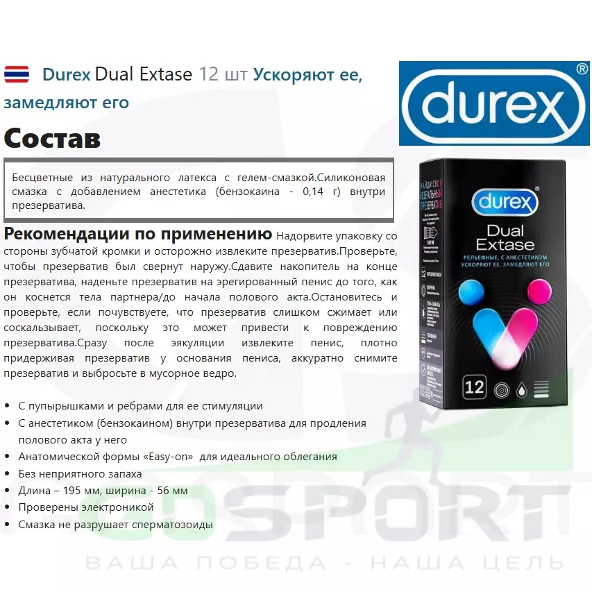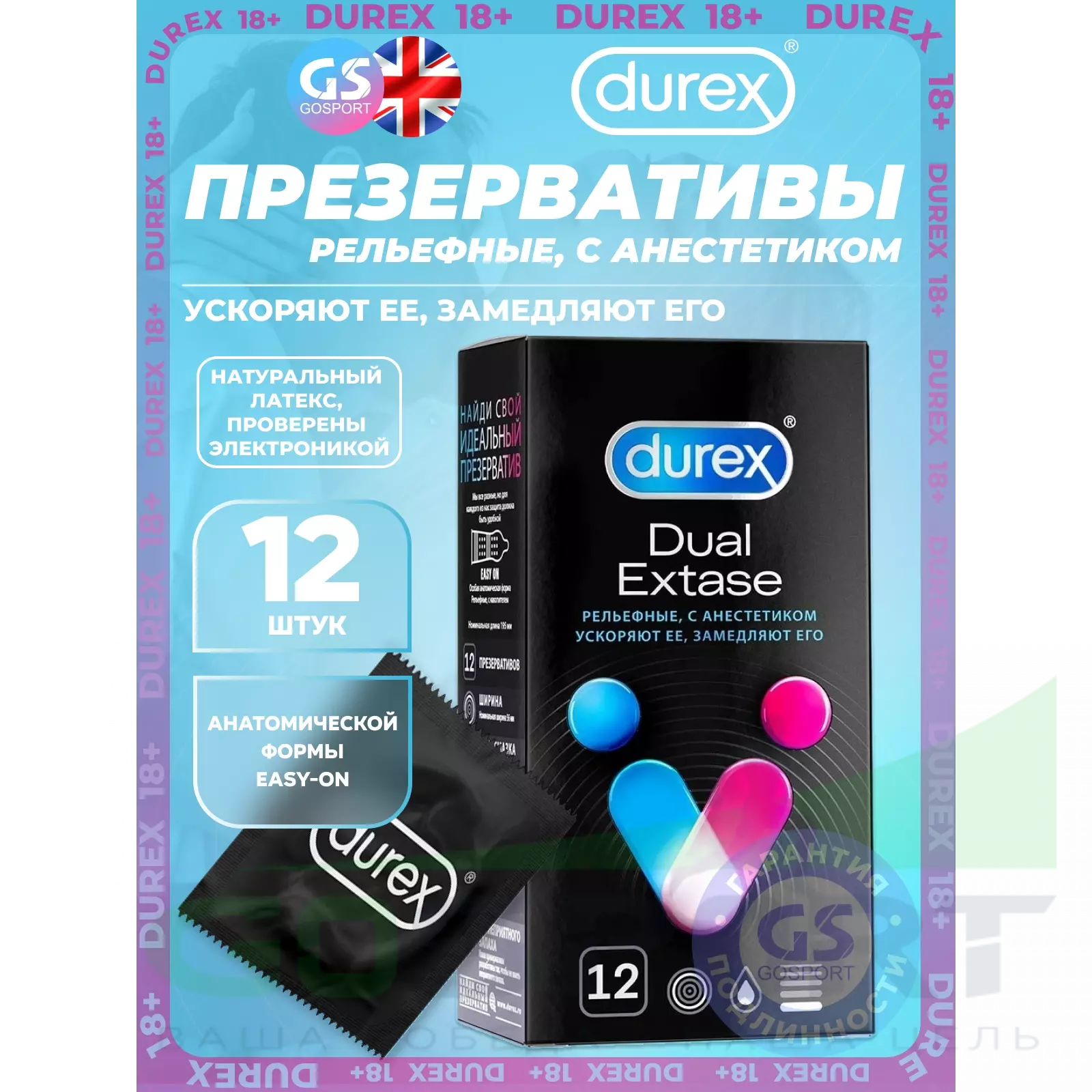 Презервативы Durex Dual Extase разработаны для достижения оргазма обоими партнерами. С ребрами и пупырышками на поверхности презерватива для усиления стимуляции женщины. С добавлением анестетика (бензокаина) внутри презерватива для продления полового акта у мужчины.