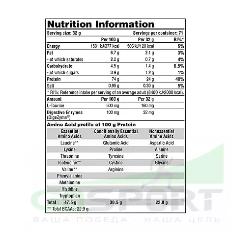 Формула протеина 100 Whey включает сывороточный концентрат, сывороточный изолят и сывороточный гидролизат. С каждой порцией вы обеспечите себя 23 г белка, причем усваивается сывороточный протеин очень быстро. Для еще более быстрого эффекта в состав протеина добавлены пищеварительные ферменты. Степень усвоения сывороточного протеина тоже довольно высокая. Принимая данный протеин, можно снабжать свои мышцы аминокислотами быстро и в большом объеме.