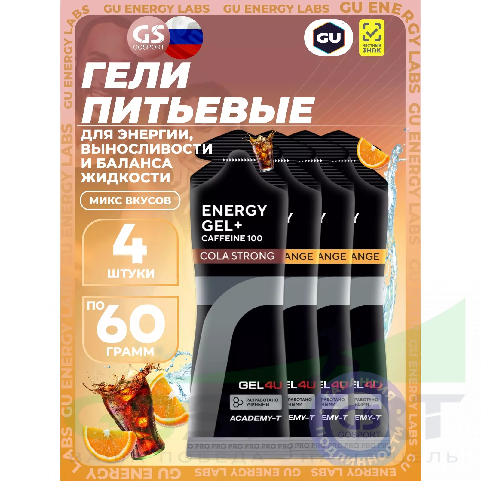 GEL4U Energy Gel MIX 4 x 60 г, Апельсин, Кола №2 — Энергия, выносливость и баланс жидкости
