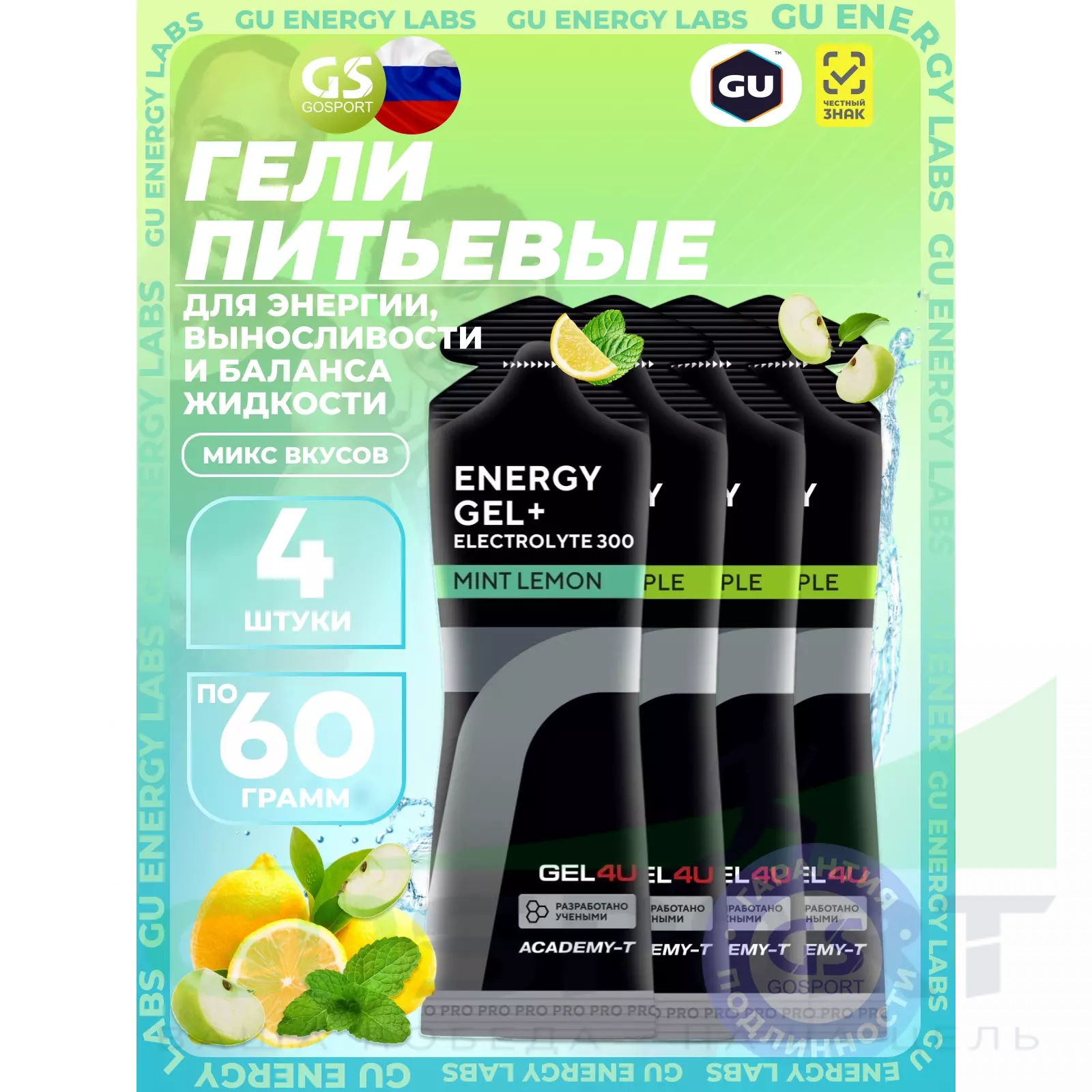 GEL4U Energy Gel MIX 4 x 60 г, Яблоко, Лимон и Мята №2 — Энергия, выносливость и баланс жидкости