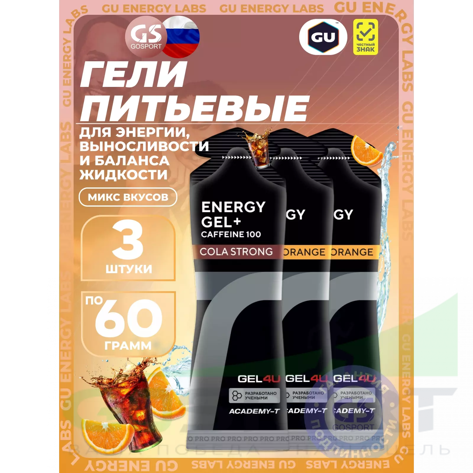 GEL4U Energy Gel MIX 3 x 60 г, Апельсин, Кола — Энергия, выносливость и баланс жидкости