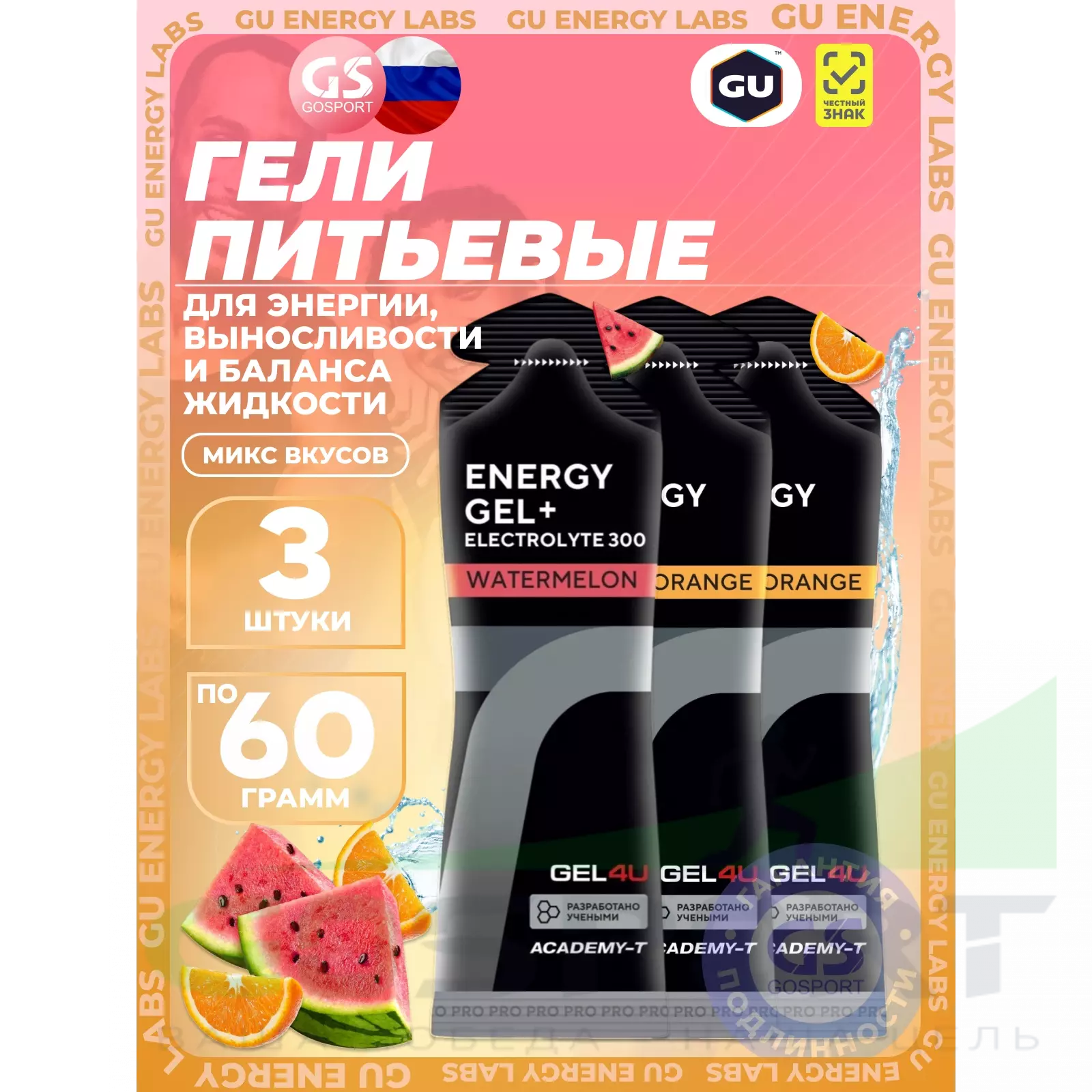 GEL4U Energy Gel MIX 3 x 60 г, Апельсин, Арбуз — Энергия, выносливость и баланс жидкости