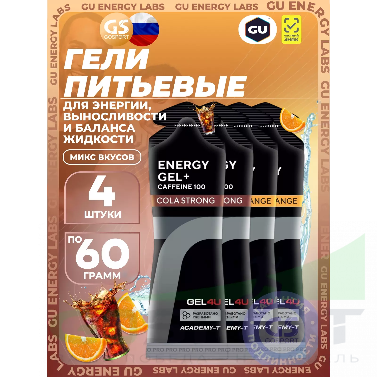 GEL4U Energy Gel MIX 4 x 60 г, Апельсин, Кола №1 — Энергия, выносливость и баланс жидкости