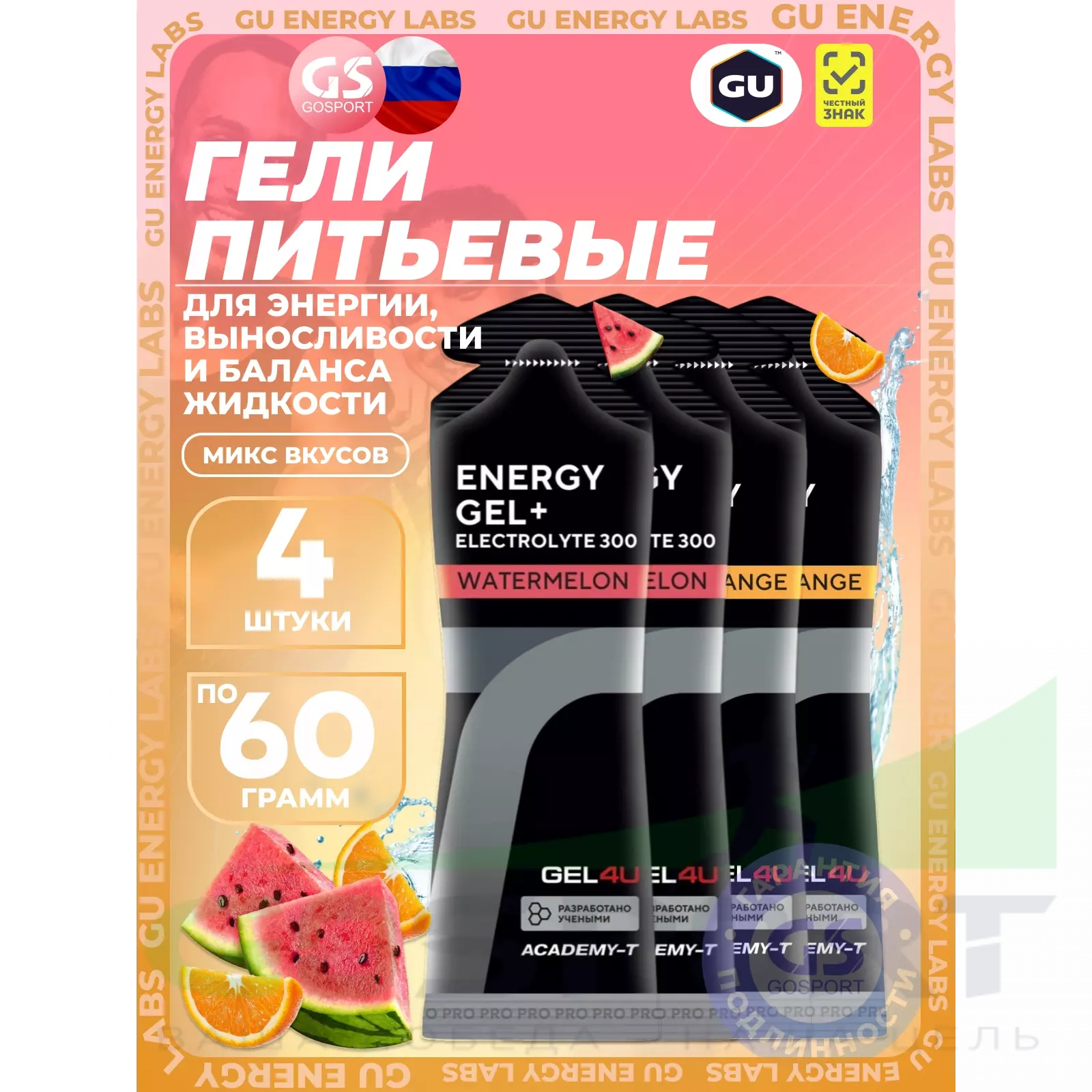 GEL4U Energy Gel MIX 4 x 60 г, Апельсин, Арбуз — Энергия, выносливость и баланс жидкости
