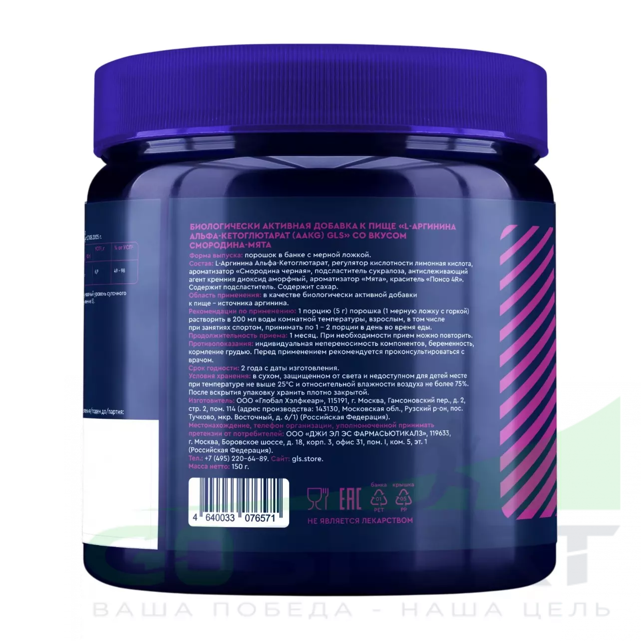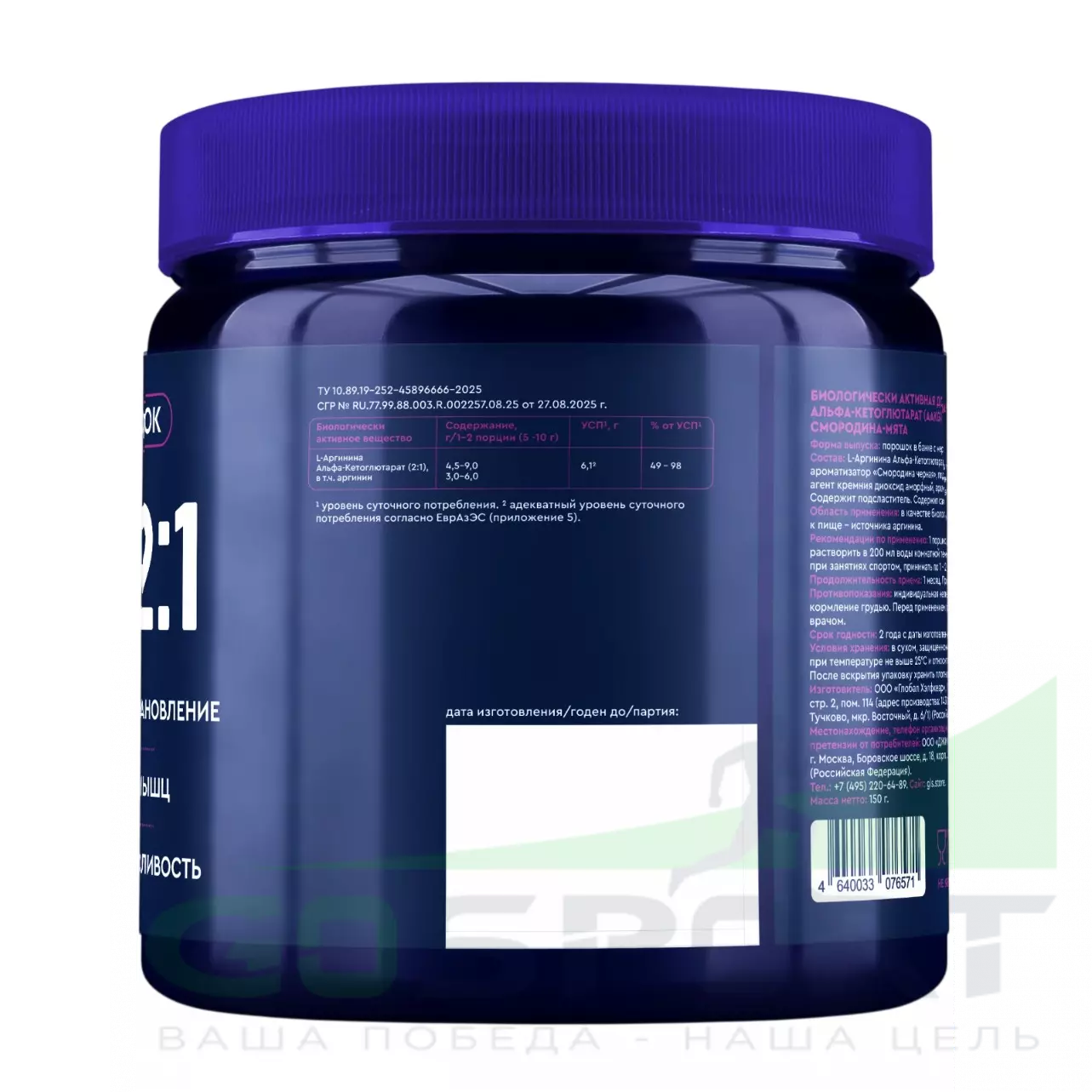 GLS pharmaceuticals AAKG 2:1 4500 мг 150 г, Смородина - мята — Пампинг, выносливость, восстановление