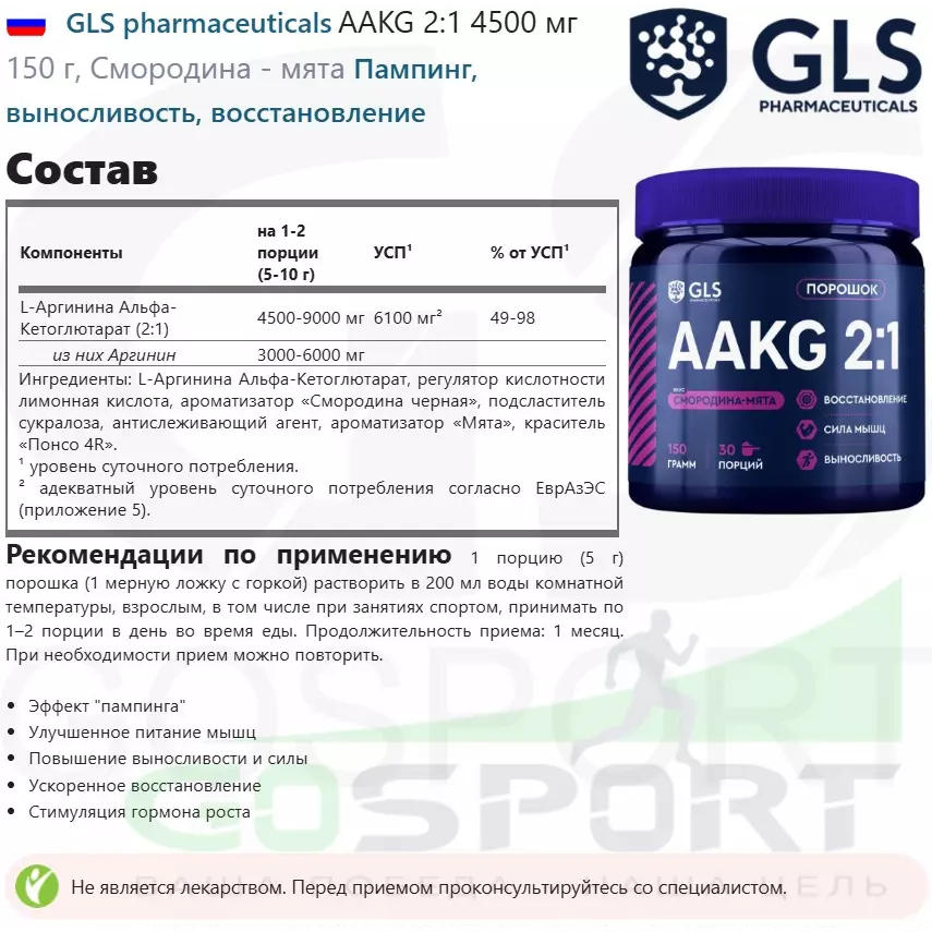 Описание GLS pharmaceuticals AAKG 2:1 4500 мг