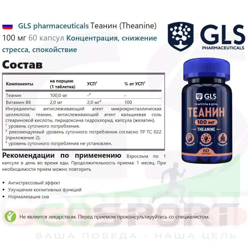 Описание GLS pharmaceuticals Теанин (Theanine) 100 мг