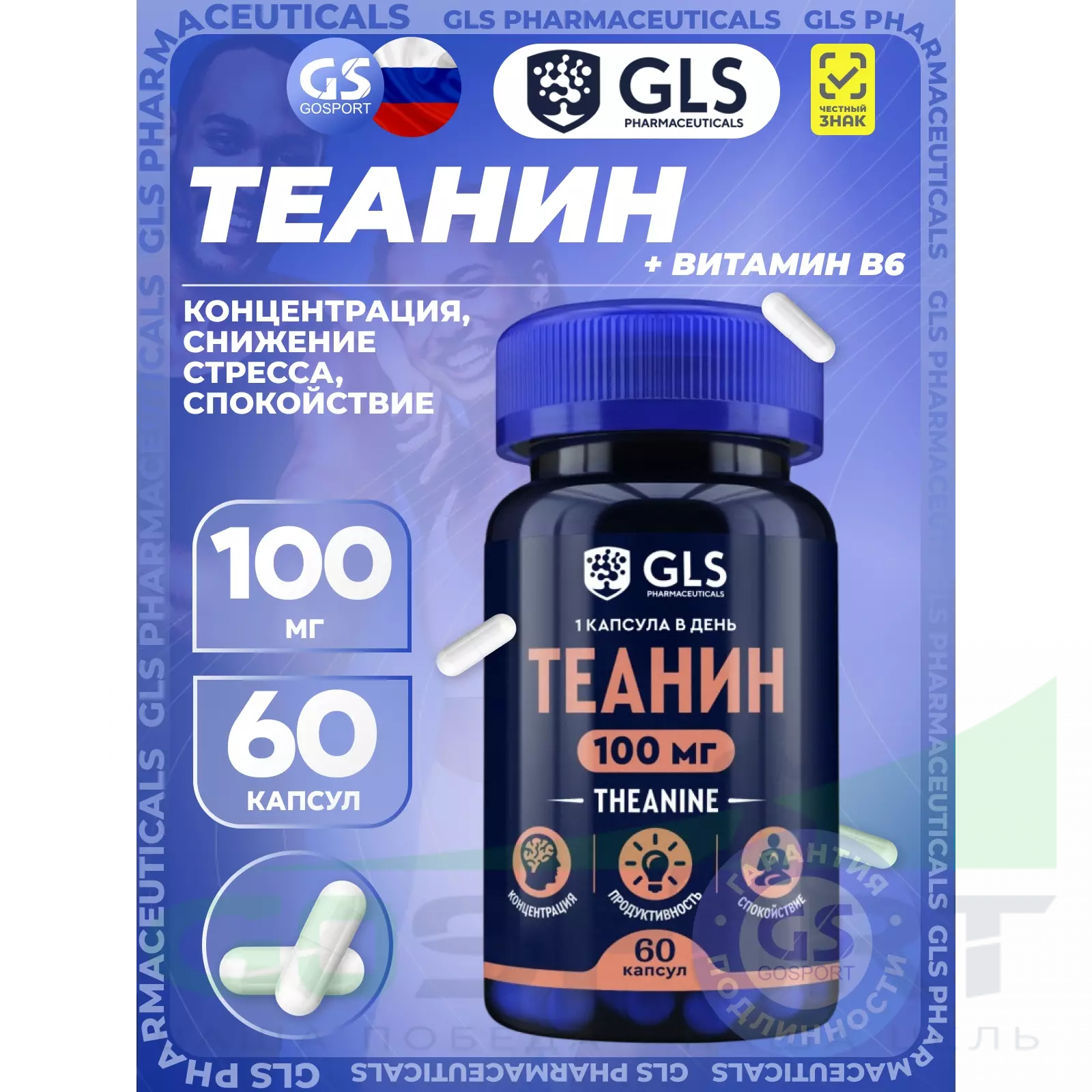 GLS pharmaceuticals Теанин (Theanine) 100 мг 60 капсул — Концентрация, снижение стресса, спокойствие