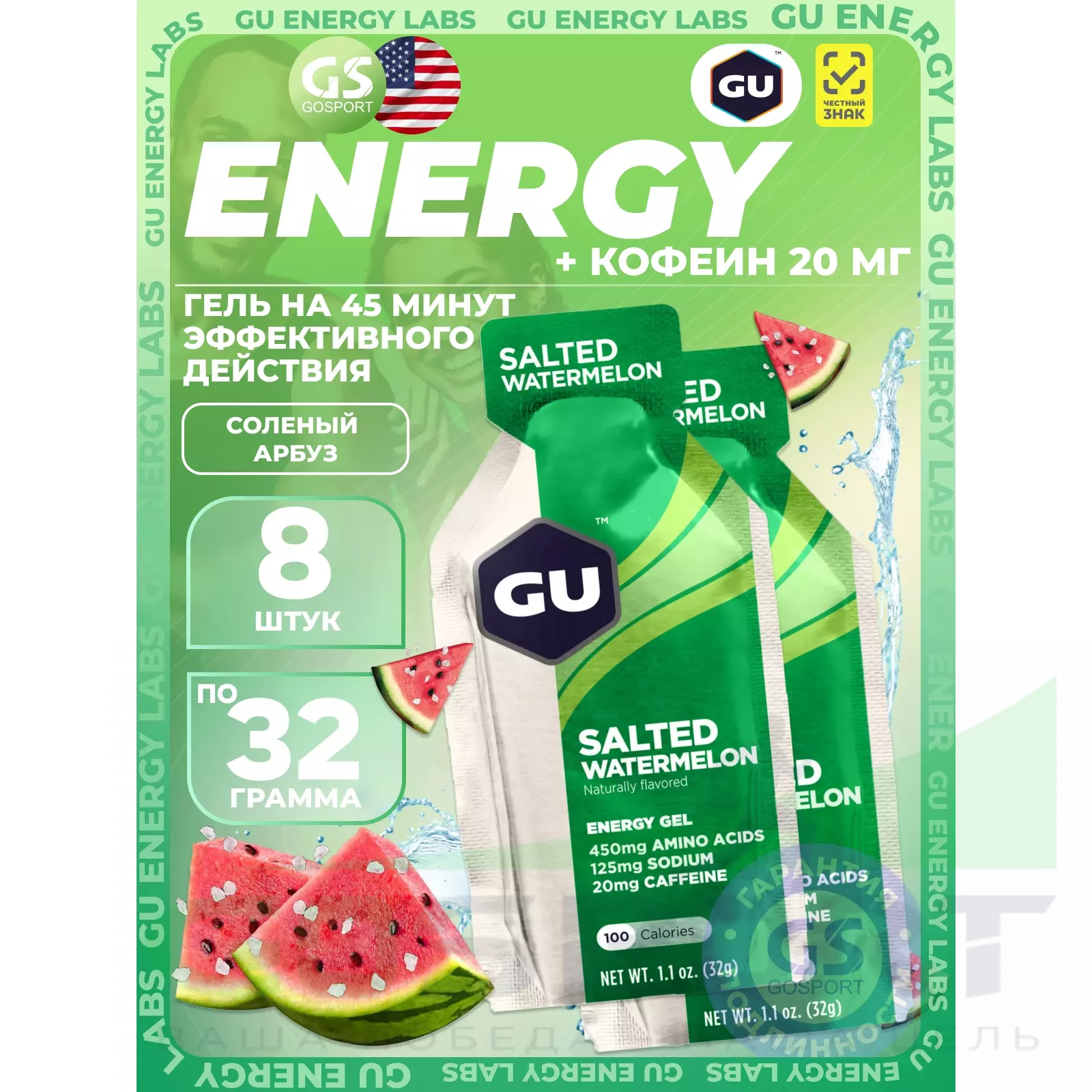 GU Original Energy Gel 20mg caffeine 8 x 32 г, Соленый Арбуз