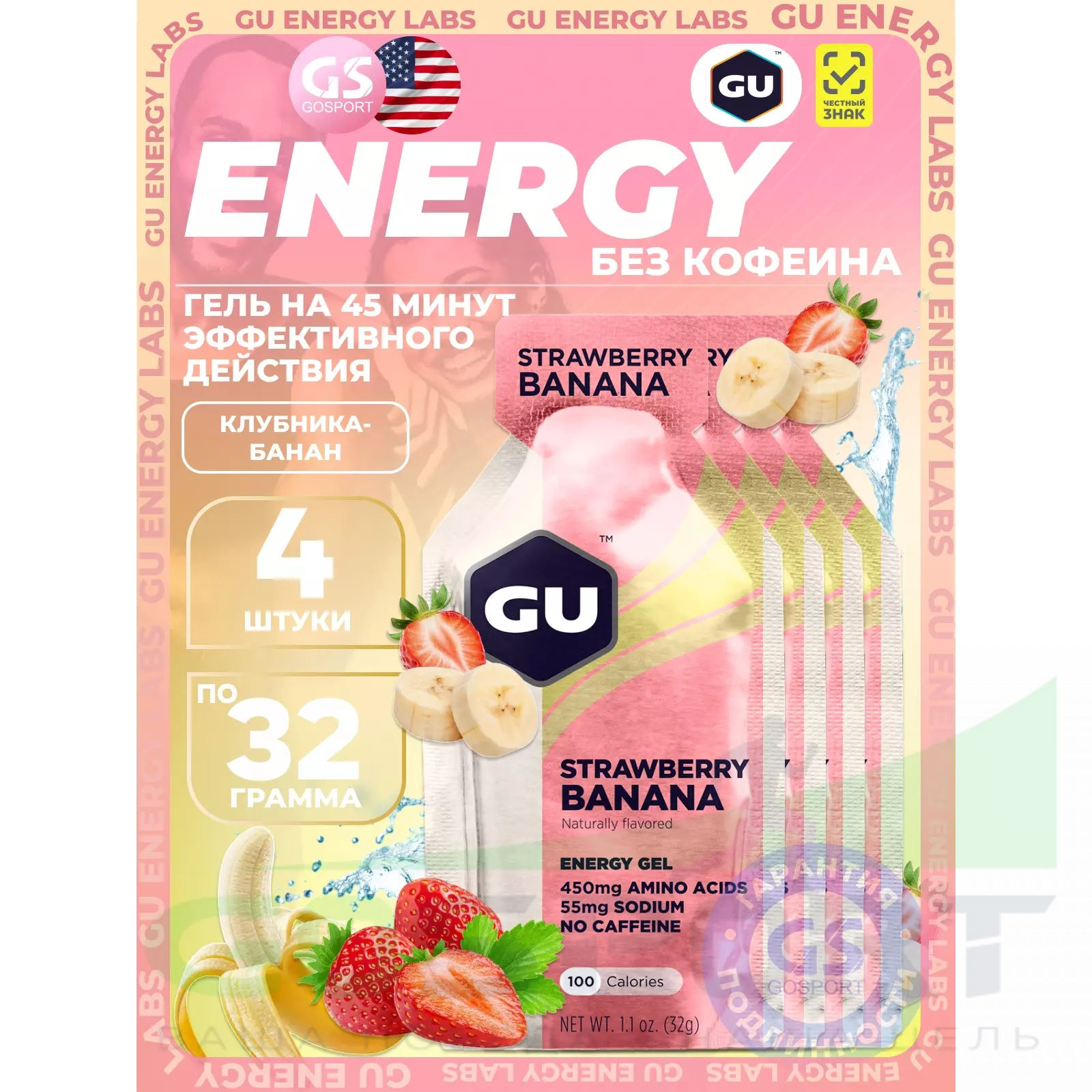 GU Energy Labs GU Original Energy Gel no caffeine 4 x 32 г, Клубника-Банан — Высокая калорийность, два вида углеводов, лёгкий