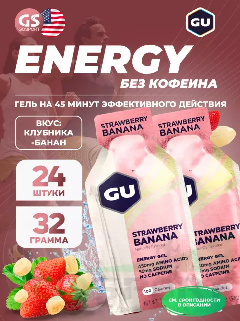 GU Energy Labs GU Original Energy Gel no caffeine 24 x 32 г, Клубника-Банан — Высокая калорийность, Два вида углеводов, Лёгкий