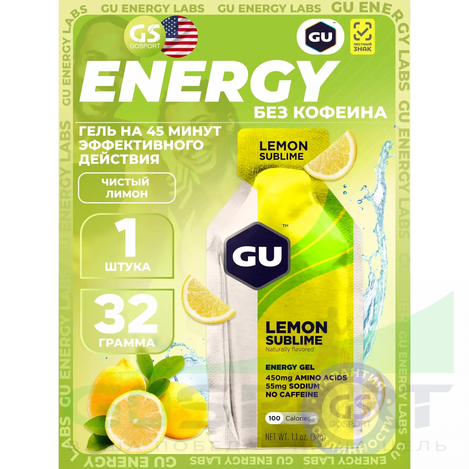 GU Energy Labs GU Original Energy Gel no caffeine 32 г, Чистый лимон — Высокая калорийность, два вида углеводов, лёгкий