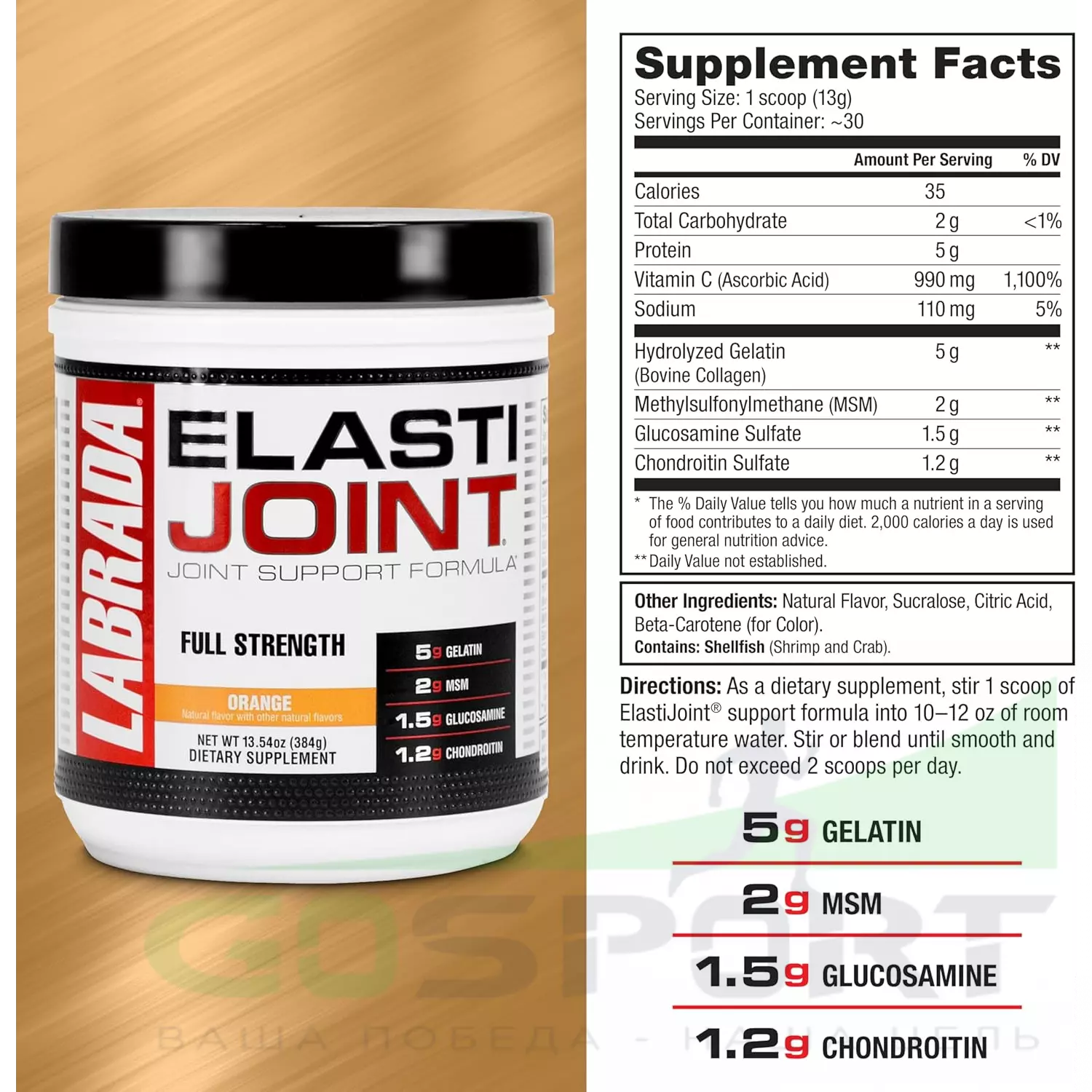 В его состав входят такие активные компоненты, как — хондроитин, глюкозамин, а также метилсульфонилметан. Эти элементы нормализуют обменные процессы в хрящевых тканях, делая их более крепкими, эластичными и здоровыми. Кроме этого, в составе Эласти Джоинт от ТМ Лабрада содержится желатин, который является источником коллагена. Систематическое применение добавки позволяет активизировать белково-углеводный обмен веществ. Улучшить синовиальную жидкость. Предотвратить развитие артрита, остеопороза, а также прочих заболеваний опорно-двигательной системы.