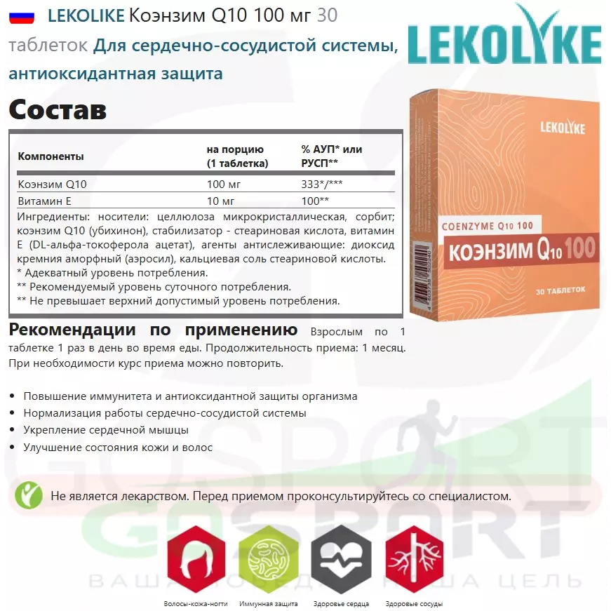 LEKOLIKE Коэнзим Q10 100 мг 30 таблеток — Для сердечно-сосудистой системы, антиоксидантная защита