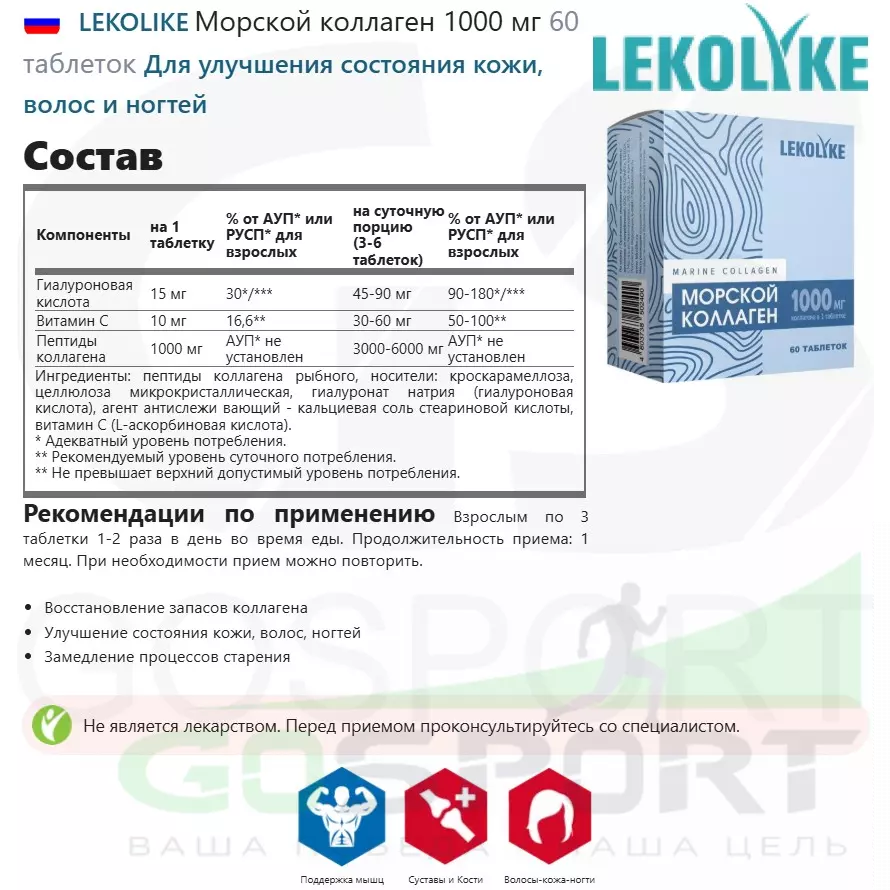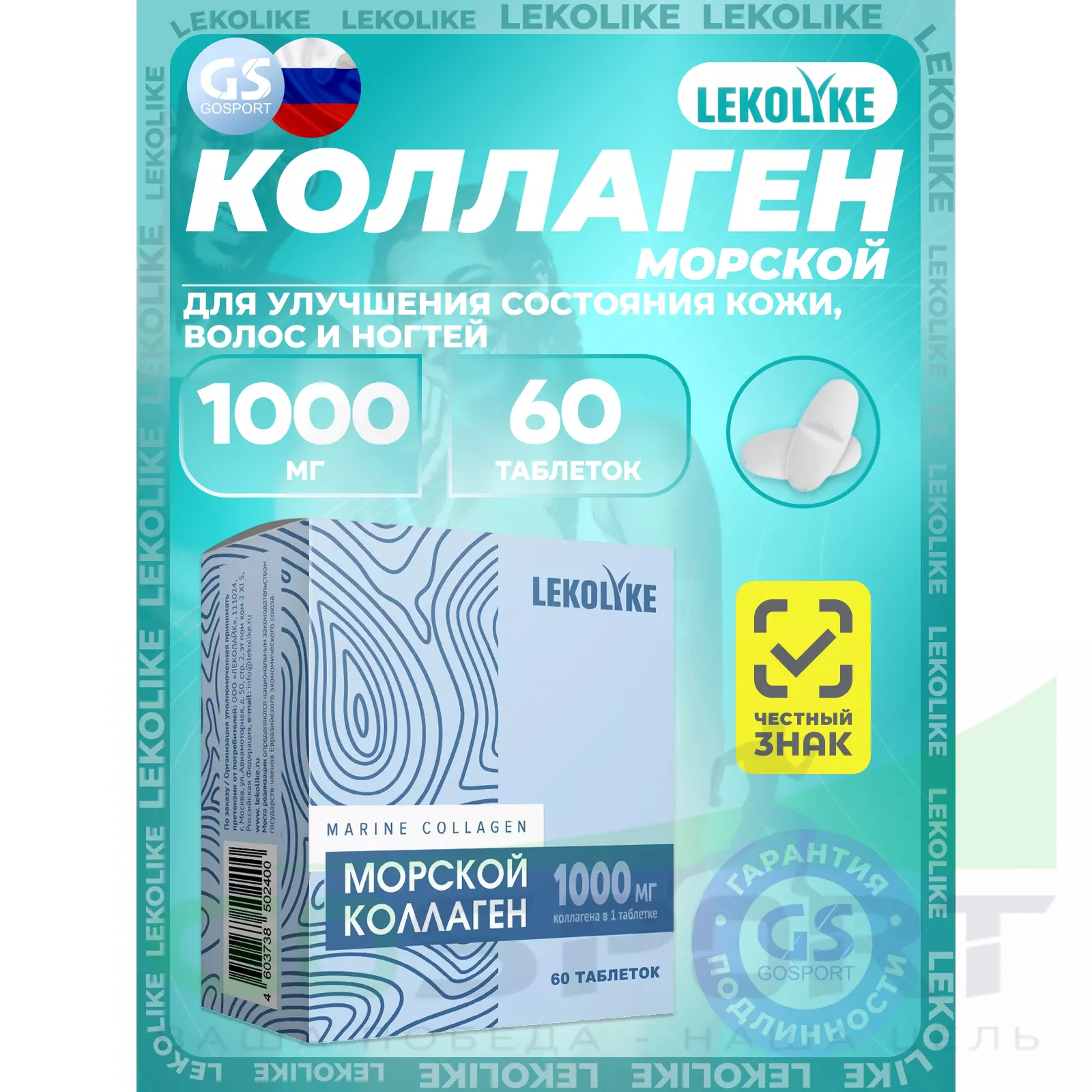LEKOLIKE Морской коллаген 1000 мг 60 таблеток — Для улучшения состояния кожи, волос и ногтей