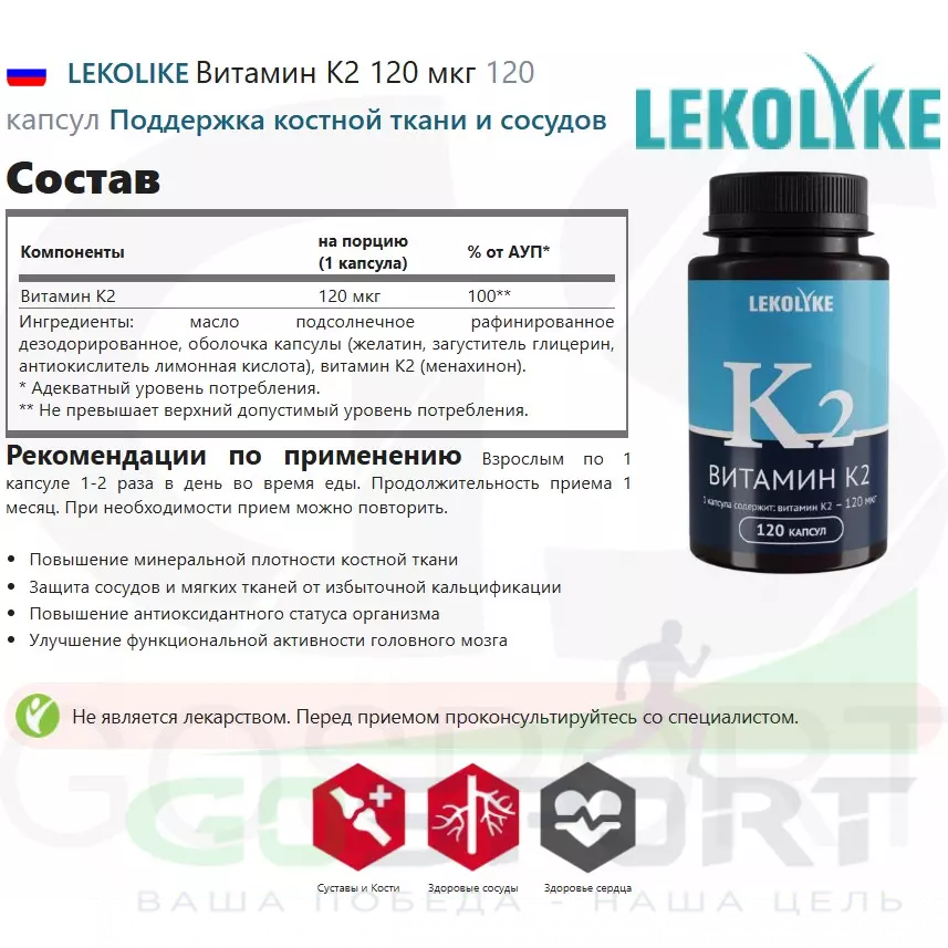 Препарат «Витамин К2» от компании «Леколайк» содержит суточную дозу К2 и создан для устранения дефицита важнейшего витамина в организме.