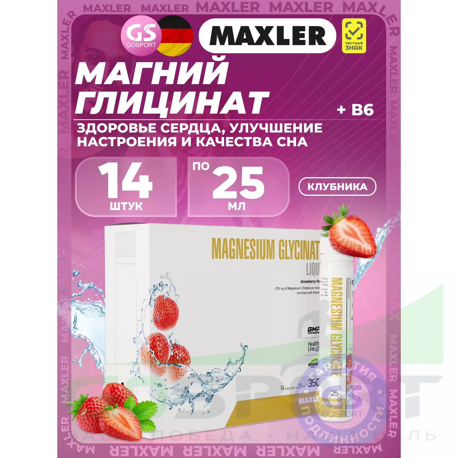 MAXLER Magnesium Glycinate Liquid 14 x 25 мл, Клубника — Здоровье сердца, улучшение настроения и качества сна