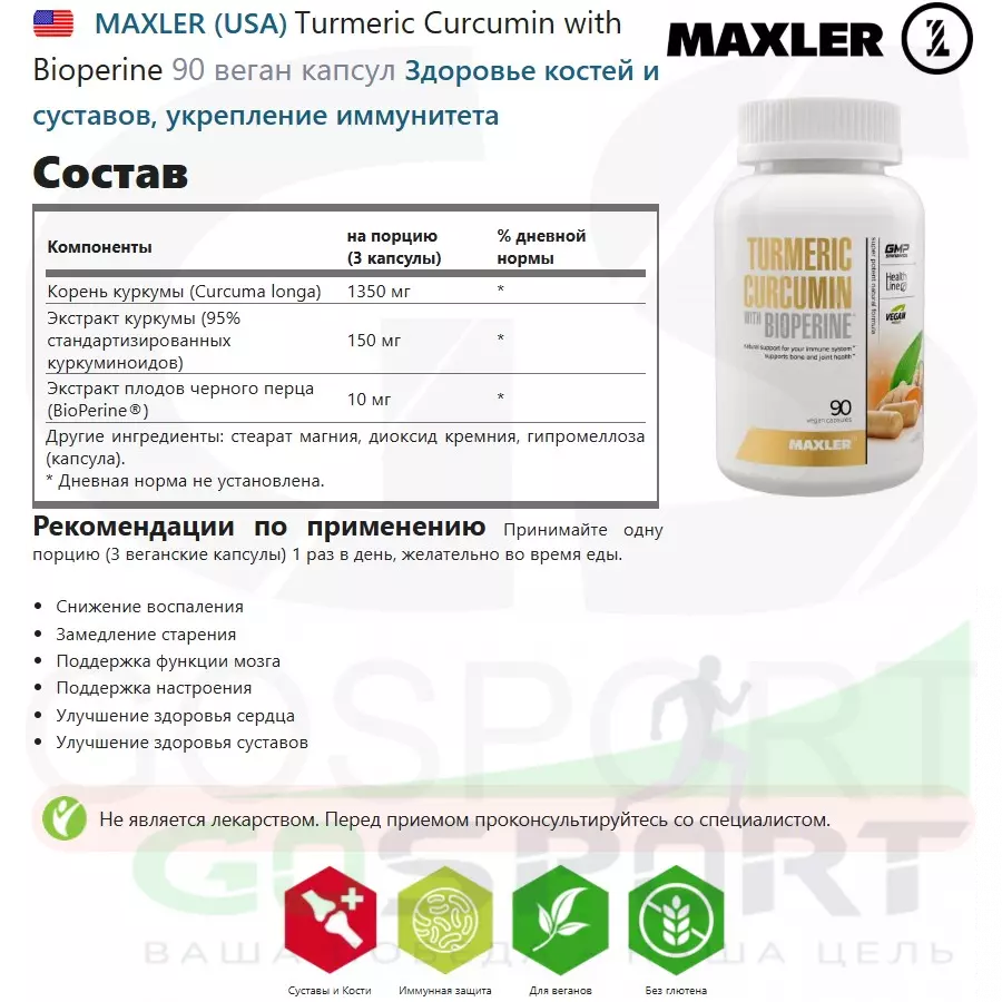MAXLER Turmeric Curcumin with Bioperine 90 веган капсул — Здоровье костей и суставов, укрепление иммунитета