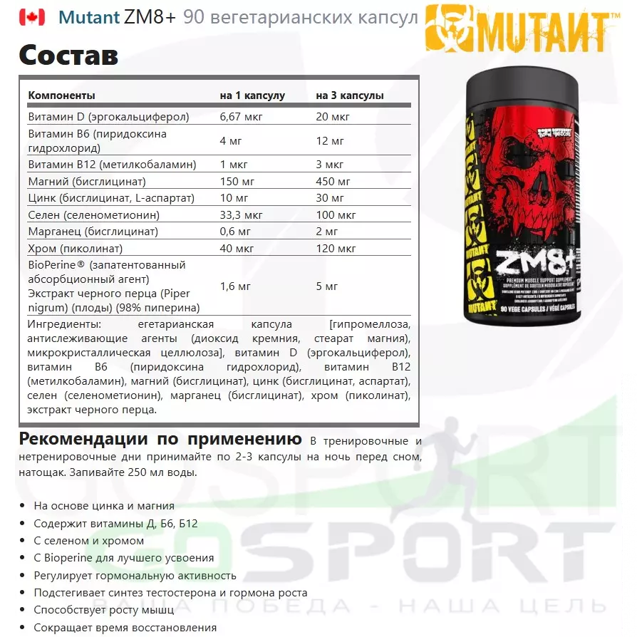 Тестостероновый бустер ZM8 Plus от Mutant включает 8 активных ингредиентов, в том числе цинк, которые способствуют увеличению уровня тестостерона и гормона роста в крови. Данные гормоны обладают сильными анаболическими свойствами, т.е. стимулируют синтез белка и, как следствие, мышечный рост. Нужны они и для нормального восстановления организма уже после физических нагрузок. Повышая уровень данных гормонов в теле, можно значительно улучшить свою результативность на тренировках.